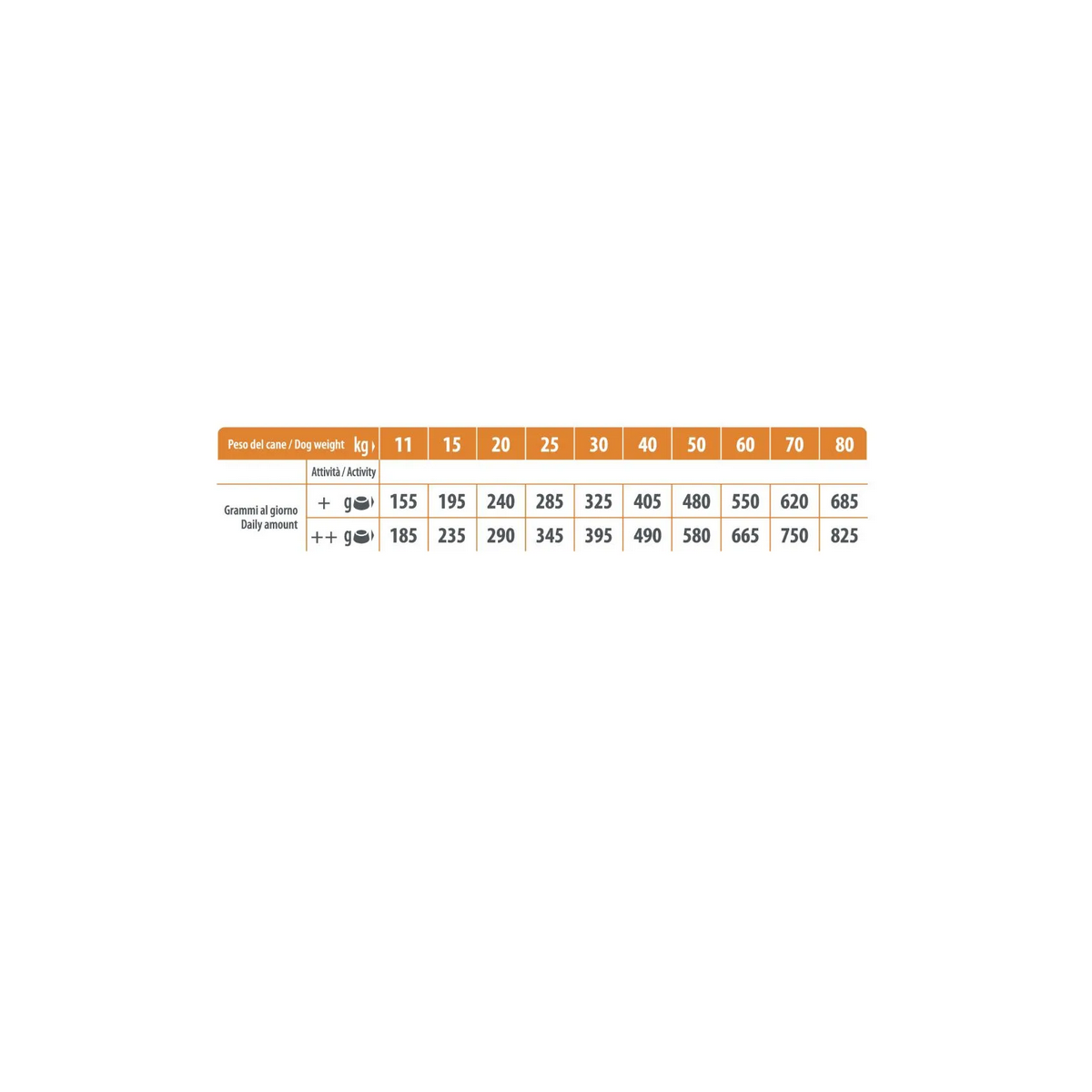 Modalità d'uso: vedere la tabella per le razioni giornaliere raccomandate. Queste quantità rappresentano solo delle linee guida. Per aiutare a mantenere il tuo cane nella condizione corporea ideale, adattare le quantità di cibo giornaliere a seconda del livello di attività, condizione fisica e dei bisogni individuali del tuo amico a quattro zampe. Lasciare sempre a disposizione acqua pulita e fresca. Per tenere sotto controllo la salute del tuo cane consultare regolarmente un veterinario.
