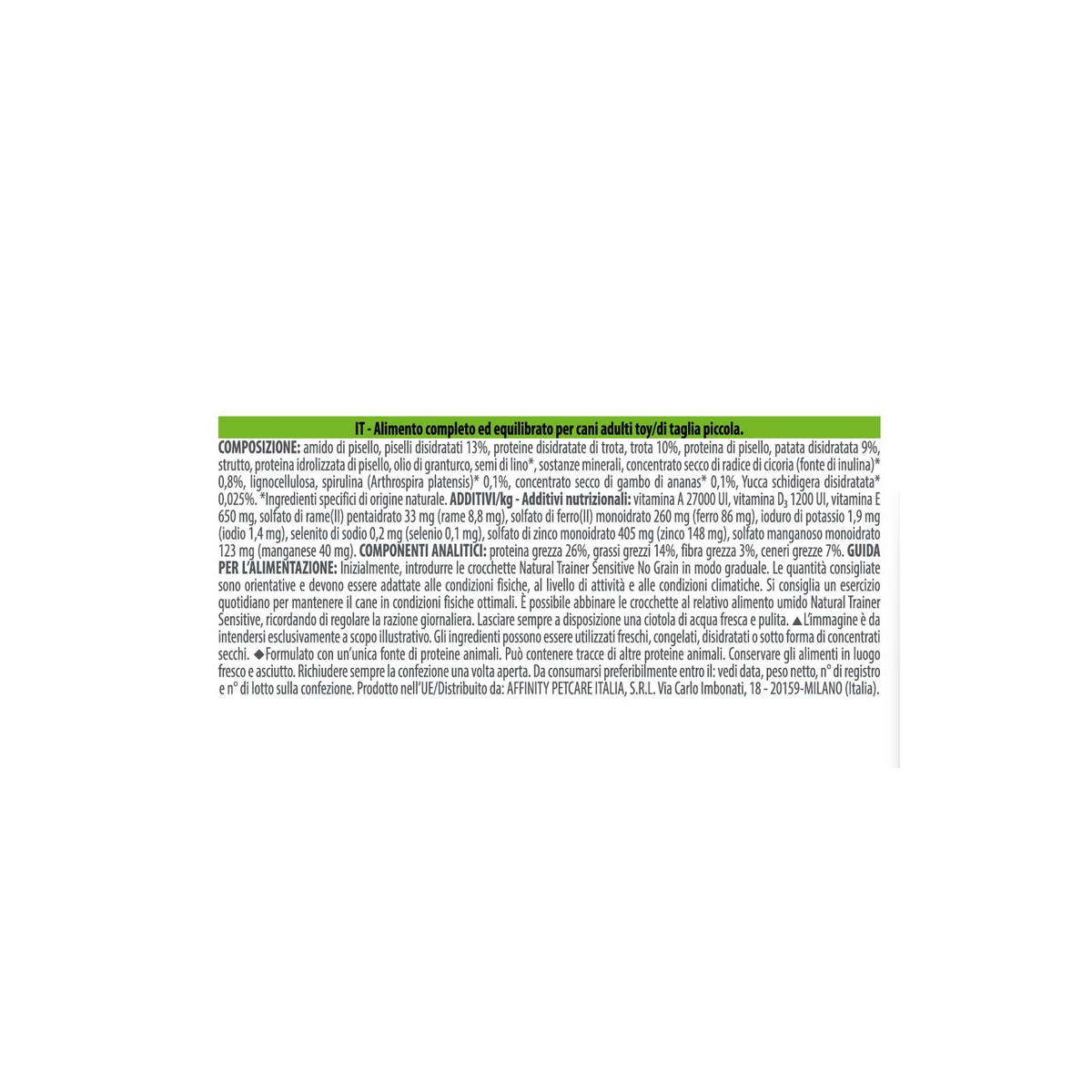 Natural Trainer Sensitive No Grain Mini Trota è un alimento completo ed equilibrato secco che aiutano la digestione nei cani con sensibilità intestinale, studiato appositamente per cani adulti di taglia piccola e toys. Le crocchette sono state formulate con ingredienti privi di glutine e quindi idoneao a cani allergici o intolleranti.