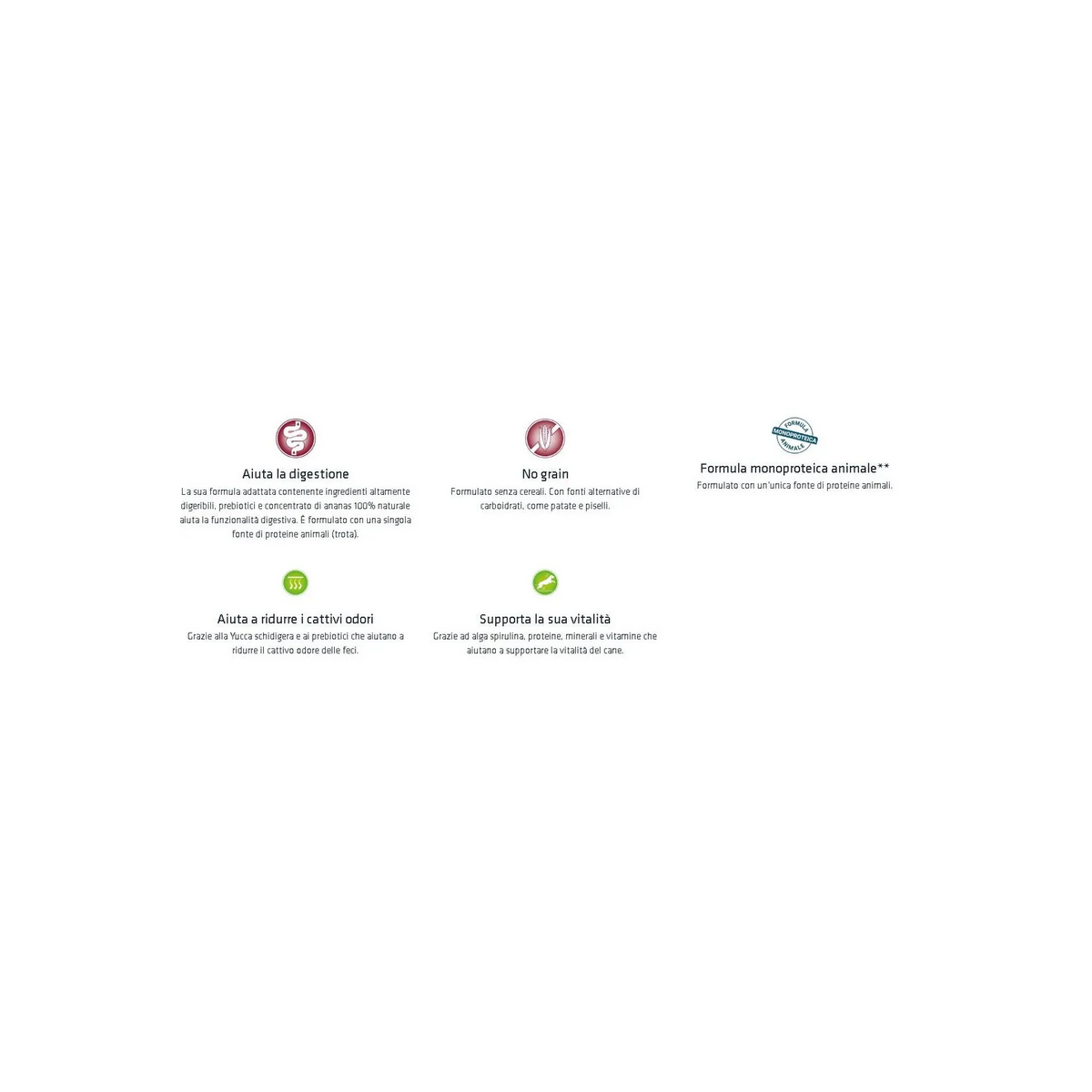 Formulato con una singola fonte di proteine animali in questo caso la trota, inoltre è formulato senza ingredienti contenenti glutine, infatti la fonte di carboidrati è data dal riso.
