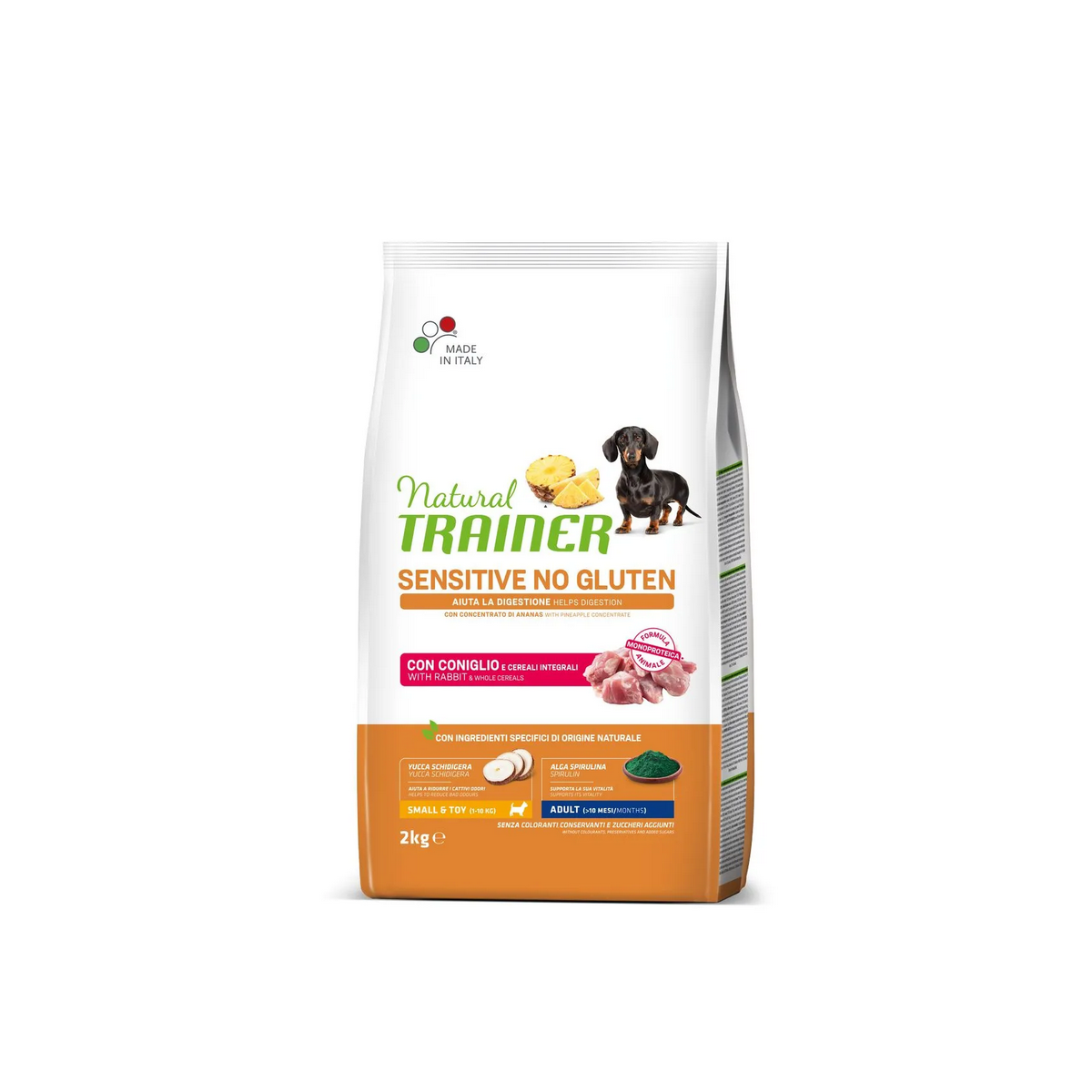 Natural Trainer Sensitive Dog No Gluten Adult Mini Coniglio è un alimento completo ed equilibrato secco che aiutano la digestione nei cani con sensibilità intestinale, studiato appositamente per cani adulti di taglia piccola e toys. Le crocchette sono state formulate con ingredienti privi di glutine e quindi idoneao a cani allergici o intolleranti.