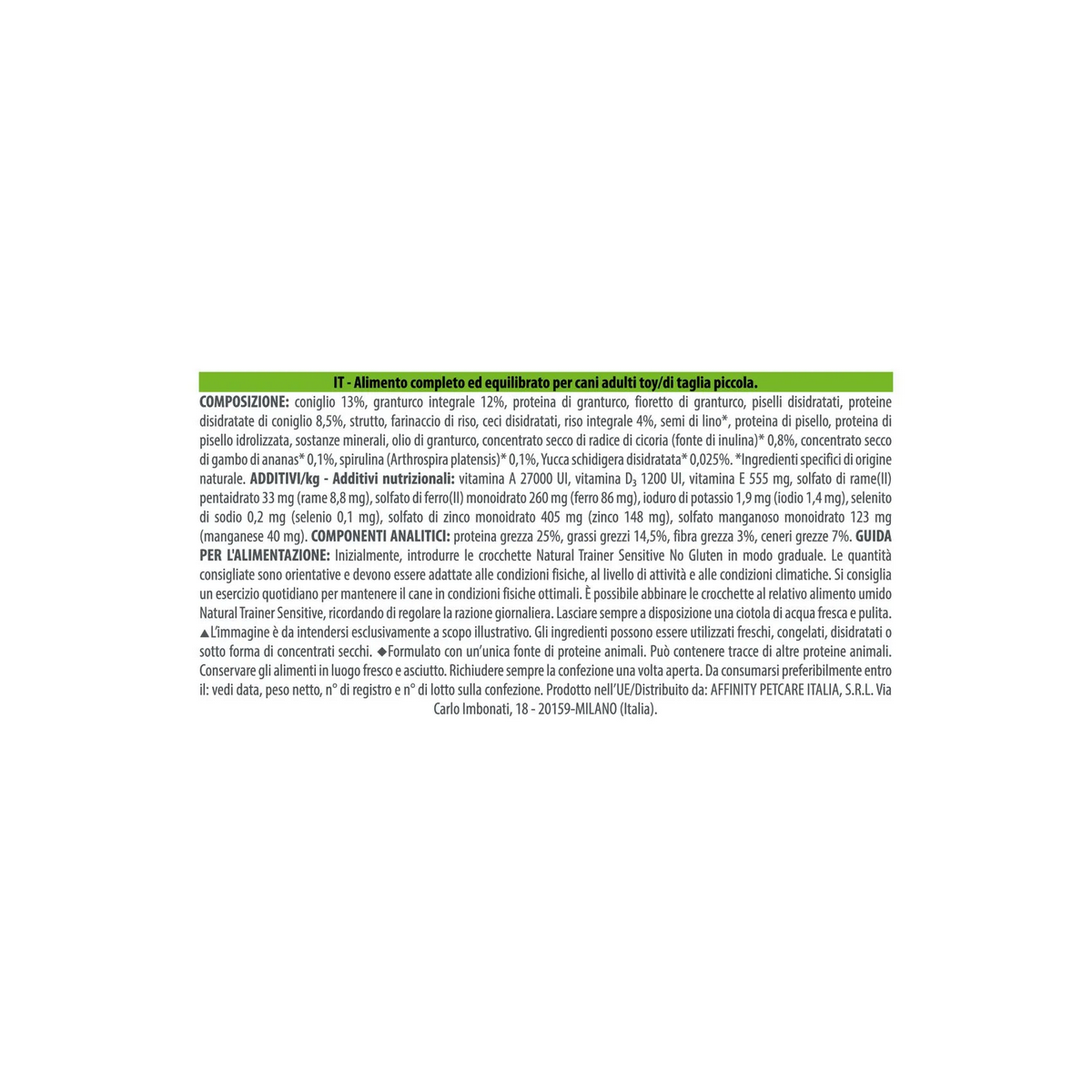 Componenti Analitici: proteina grezza 25%, grassi grezzi 14,5%, fibra grezza 3%, ceneri grezze 7%.