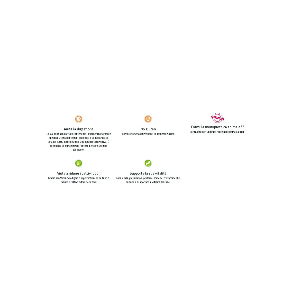 Formulato con una singola fonte di proteine animali in questo caso il coniglio, inoltre è formulato senza ingredienti contenenti glutine, infatti la fonte di carboidrati è data dal riso.