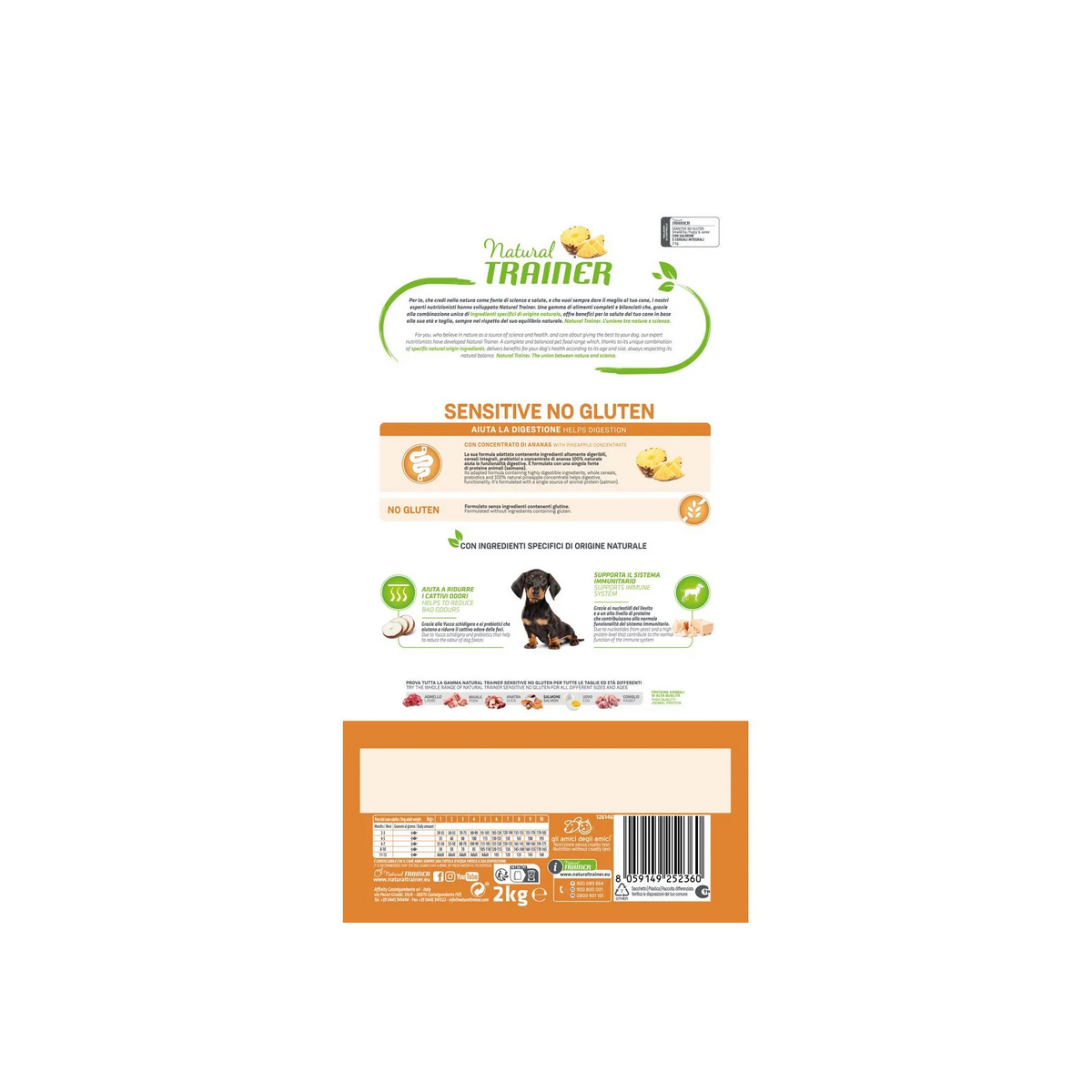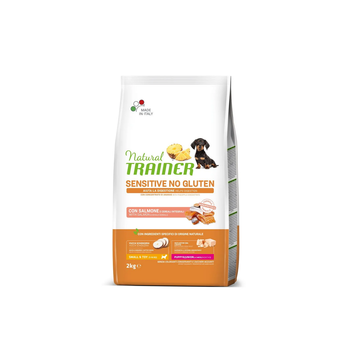 Natural Trainer Sensitive No Gluten Mini Puppy Junior con Salmone è un alimento secco completo ed equilibrato appositamente formulato per cuccioli di taglia piccola e toys con particolare sensibilità digestiva. Preparate con cura e dedizione, queste crocchette sono un concentrato di ingredienti naturali, studiati per favorire la funzionalità digestiva e promuovere il benessere generale del tuo amico fedele. Questo alimento senza glutine e senza coloranti, conservanti e zuccheri aggiunti e con ingredienti altamente digeribili contiene il salmone come sola fonte di proteina animale di alta qualità, inoltre l’estratto di ananas 100% naturale presente nella composizione di questo alimento, aggiunge un tocco di freschezza e contribuisce ad un processo digestivo più efficiente, garantendo che il tuo cucciolo possa godere appieno di ogni pasto. I cereali integrali forniscono fibre essenziali che supportano la salute intestinale, i prebiotici stimolano la crescita di batteri benefici nell'intestino, mentre gli acidi grassi Omega 3 provenienti dai semi di lino supportano la salute della pelle e del pelo, contribuendo a mantenere il manto del tuo cane lucido e sano. Inoltre, la presenza di Boswellia serrata aiuta a prendersi cura delle articolazioni, fornendo al tuo cane il supporto necessario per mantenere una mobilità agevole e confortevole nel corso degli anni.