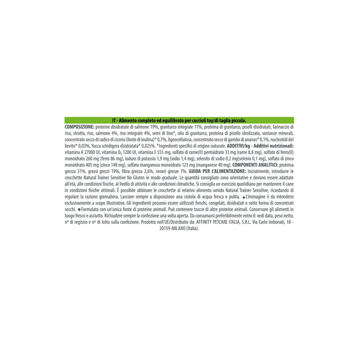Componenti analitici: proteina grezza 31%, grassi grezzi 19%, fibra grezza 2,6%, ceneri grezze 7%.