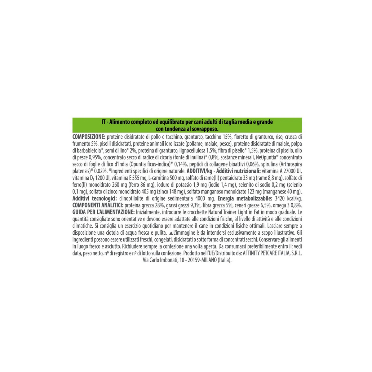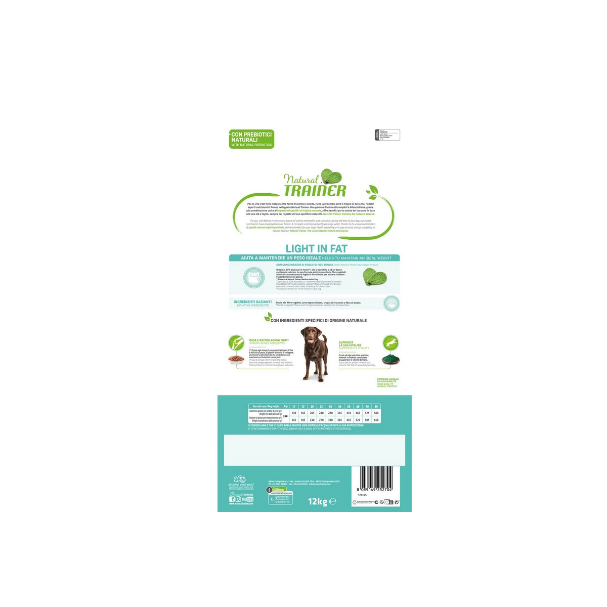 Caratterizzato dall'utilizzo di proteine di alta qualità e ingredienti naturali attentamente selezionati, questo cibo per cani è progettato per fornire tutte le sostanze nutritive essenziali di cui il tuo cane ha bisogno. La formula di Natural Trainer Light Medium Maxi Adult Tacchino è stata appositamente adattata per offrire un'opzione alimentare più leggera, con il 40% in meno di grassi rispetto ad altre formulazioni simili. Grazie alla presenza di L-carnitina e al basso contenuto calorico, questo alimento aiuta a gestire il peso corporeo del tuo cane in modo efficace. La sua composizione comprende fibre vegetali, minerali e un concentrato di foglie di fico d'India, che lavorano insieme per ridurre l'assorbimento dei grassi nell'intestino, favorendo così una migliore gestione del peso.