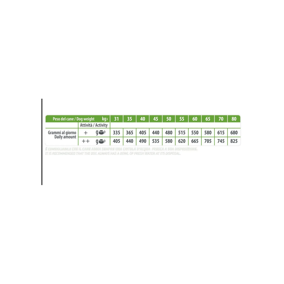 Modalità d'uso: vedere la tabella per le razioni giornaliere raccomandate. Queste quantità rappresentano solo delle linee guida. Per aiutare a mantenere il tuo cane nella condizione corporea ideale, adattare le quantità di cibo giornaliere a seconda del livello di attività, condizione fisica e dei bisogni individuali del tuo amico a quattro zampe. Lasciare sempre a disposizione acqua pulita e fresca. Per tenere sotto controllo la salute del tuo cane consultare regolarmente un veterinario. Conservare gli alimenti in luogo fresco e asciutto. Richiudere sempre la confezione una volta aperta.