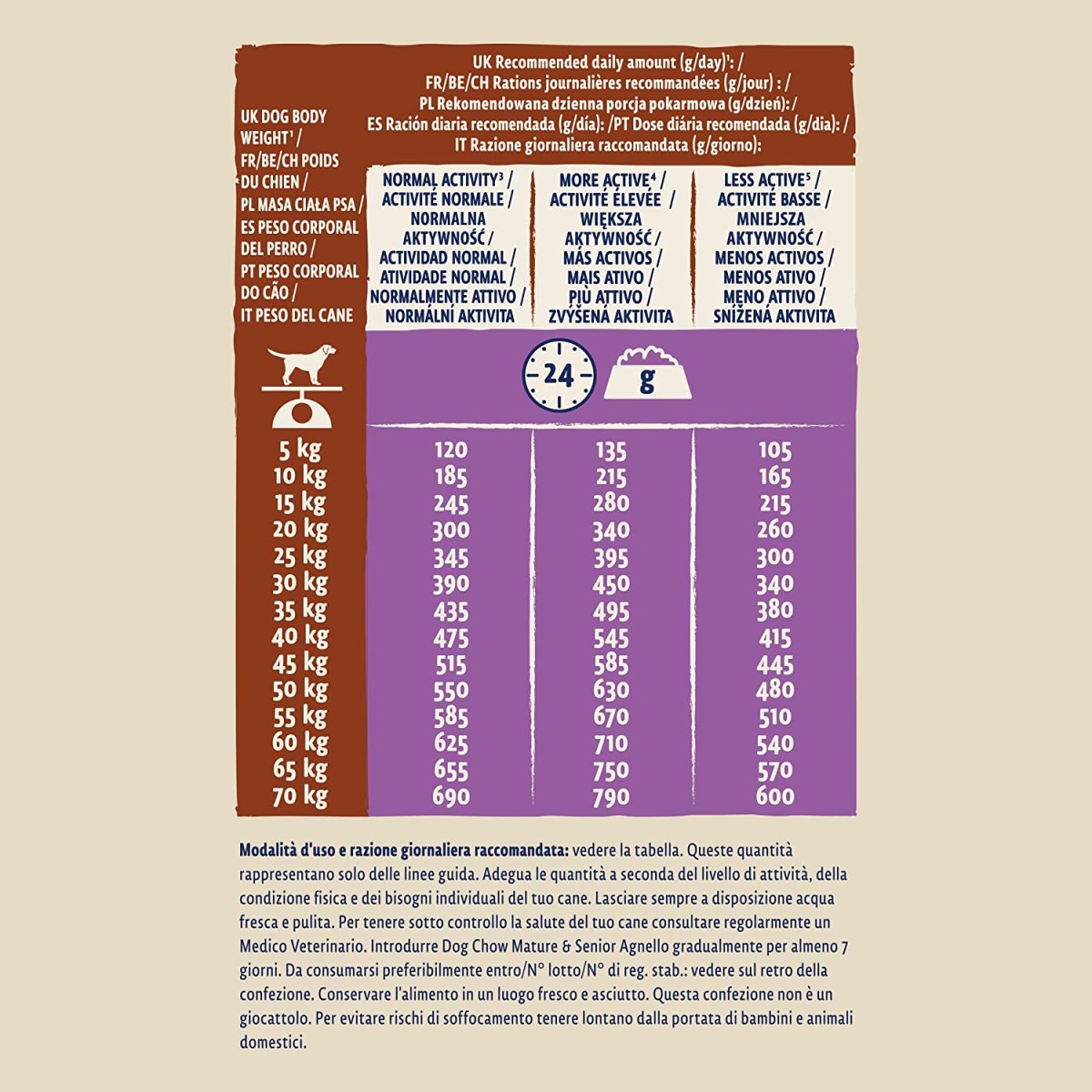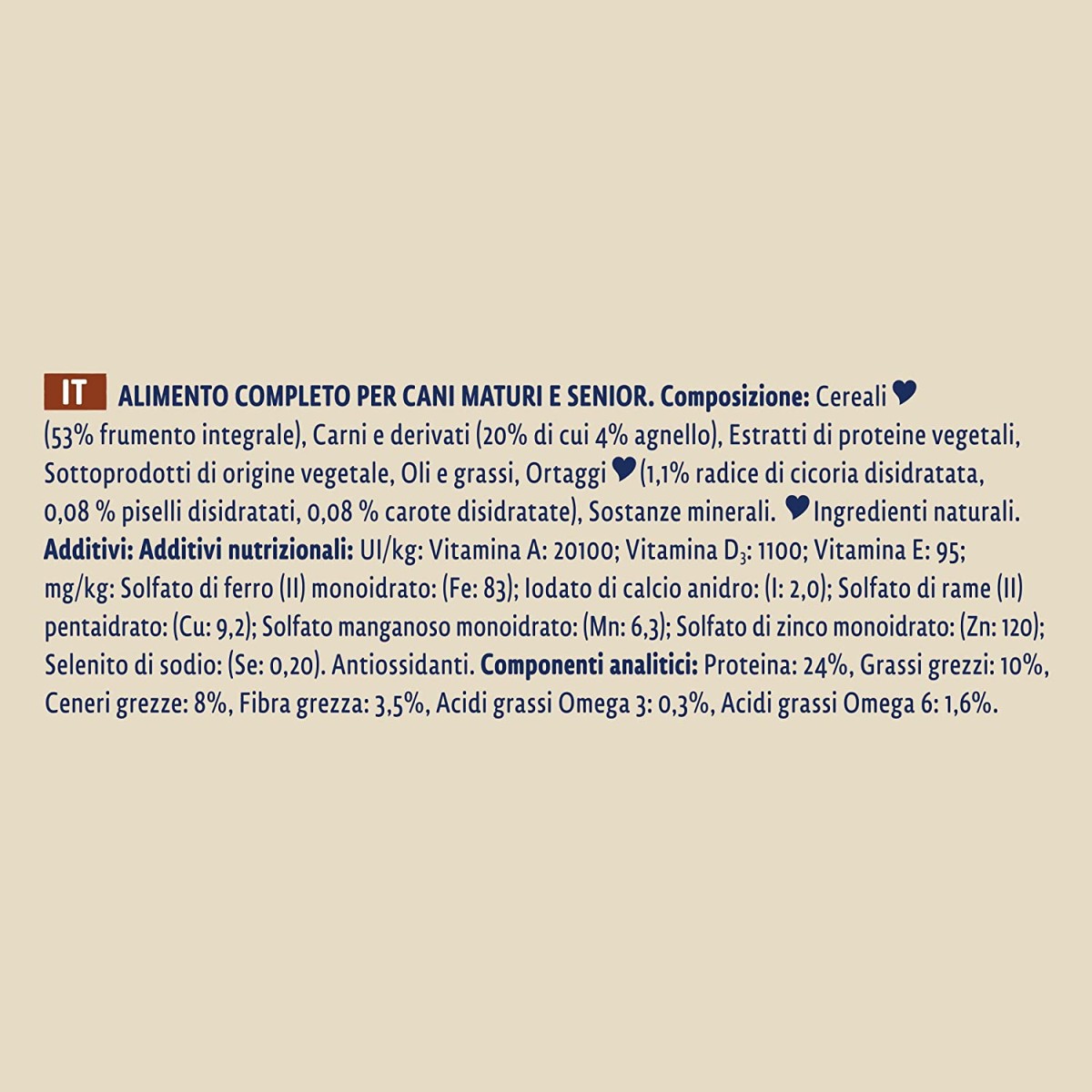Dog Chow® Mature & Senior con agnello garantisce una nutrizione completa e bilanciata al 100%, sviluppata per cani adulti a partire dai 7 anni contiente amminoacidi essenziali per sostenere gli organi vitali incluso il cuore.