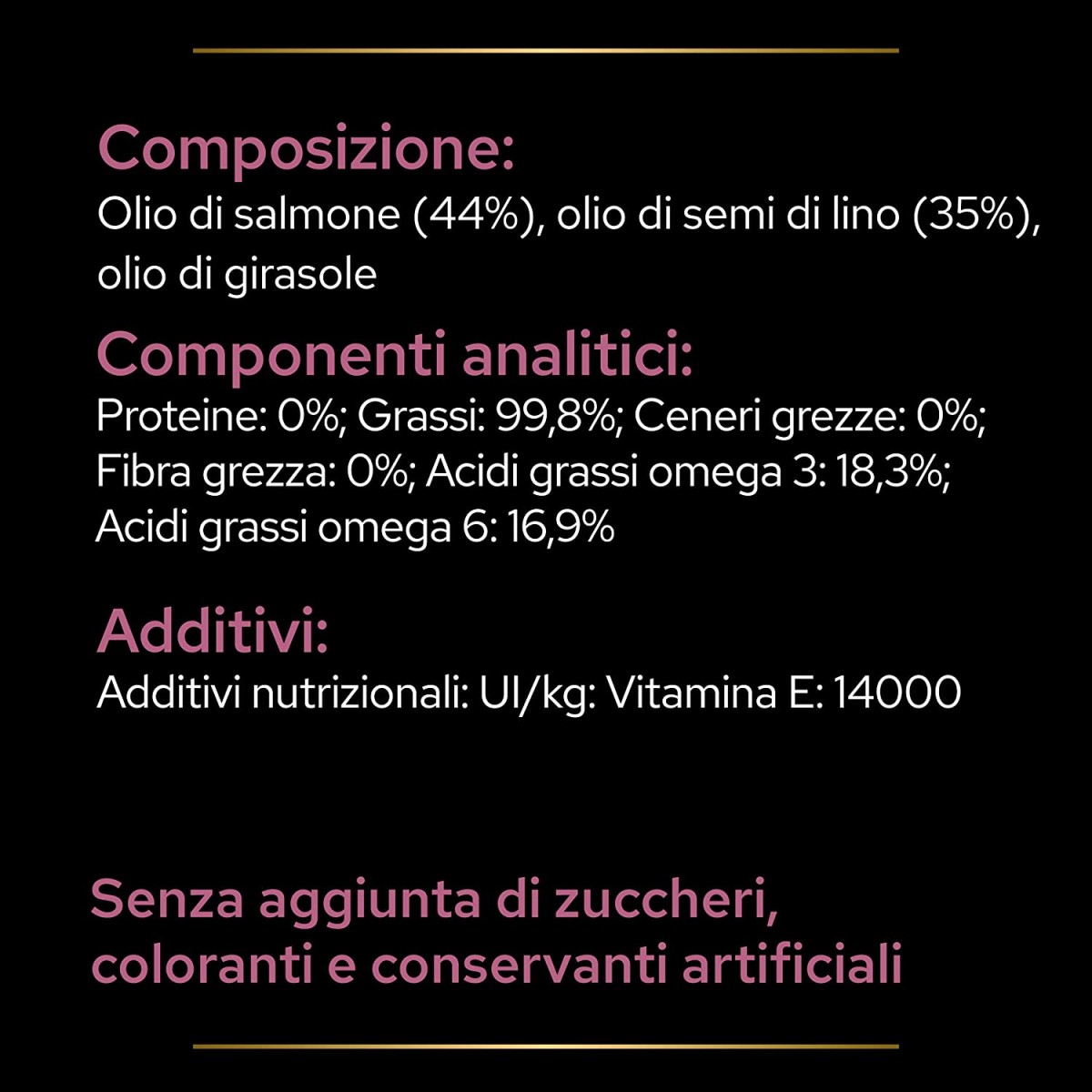 Componenti: olio di salmone (44%), olio di semi di lino (35%), olio di semi di girasole.