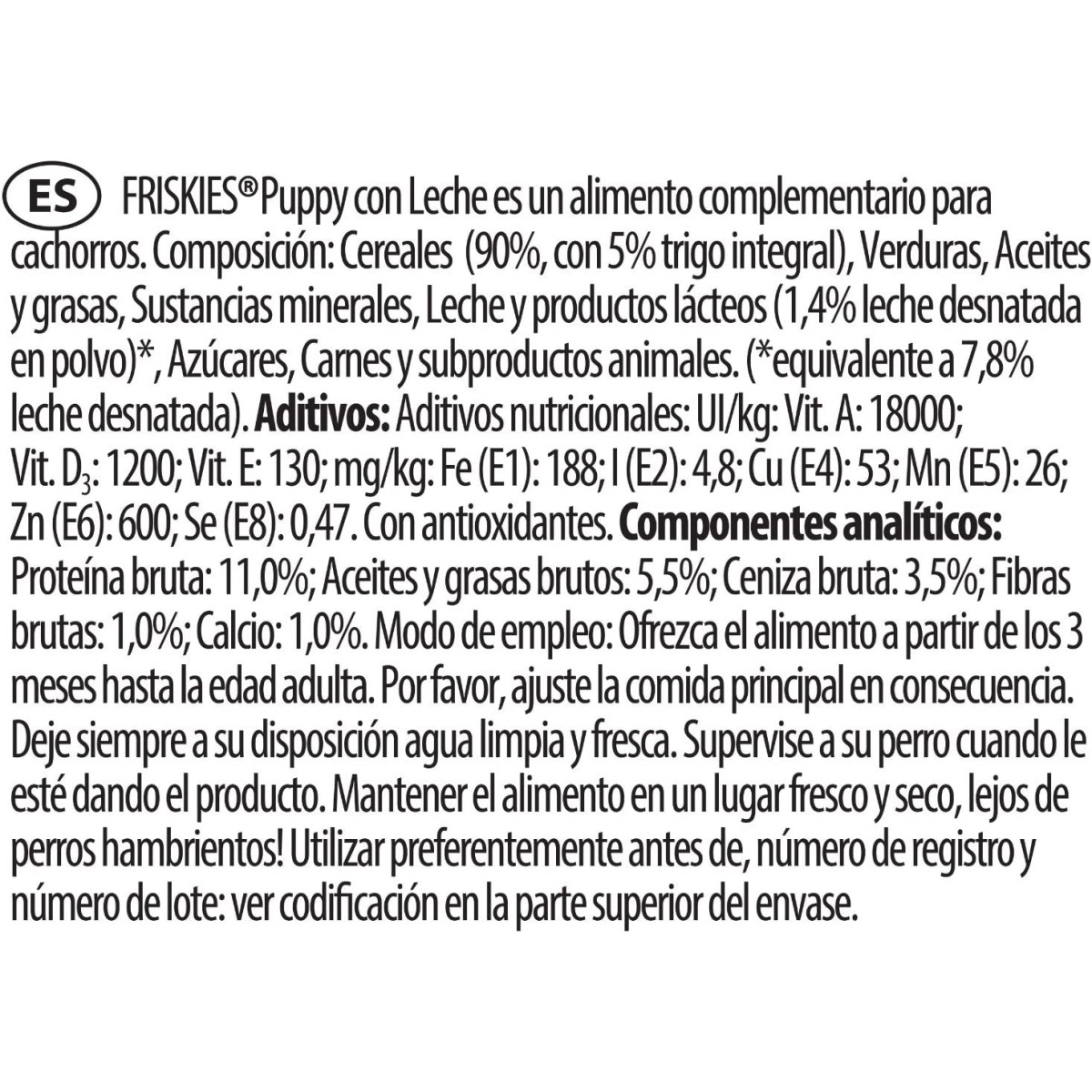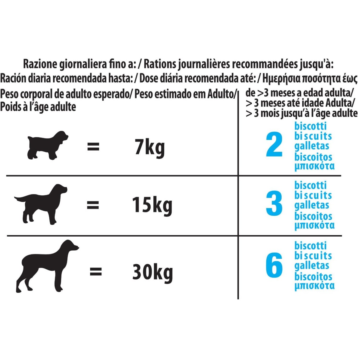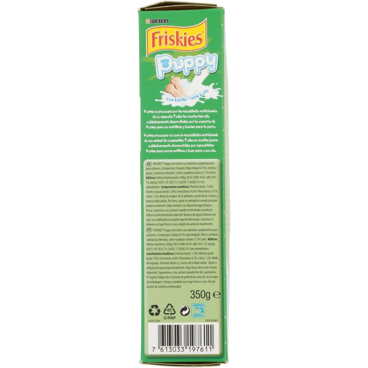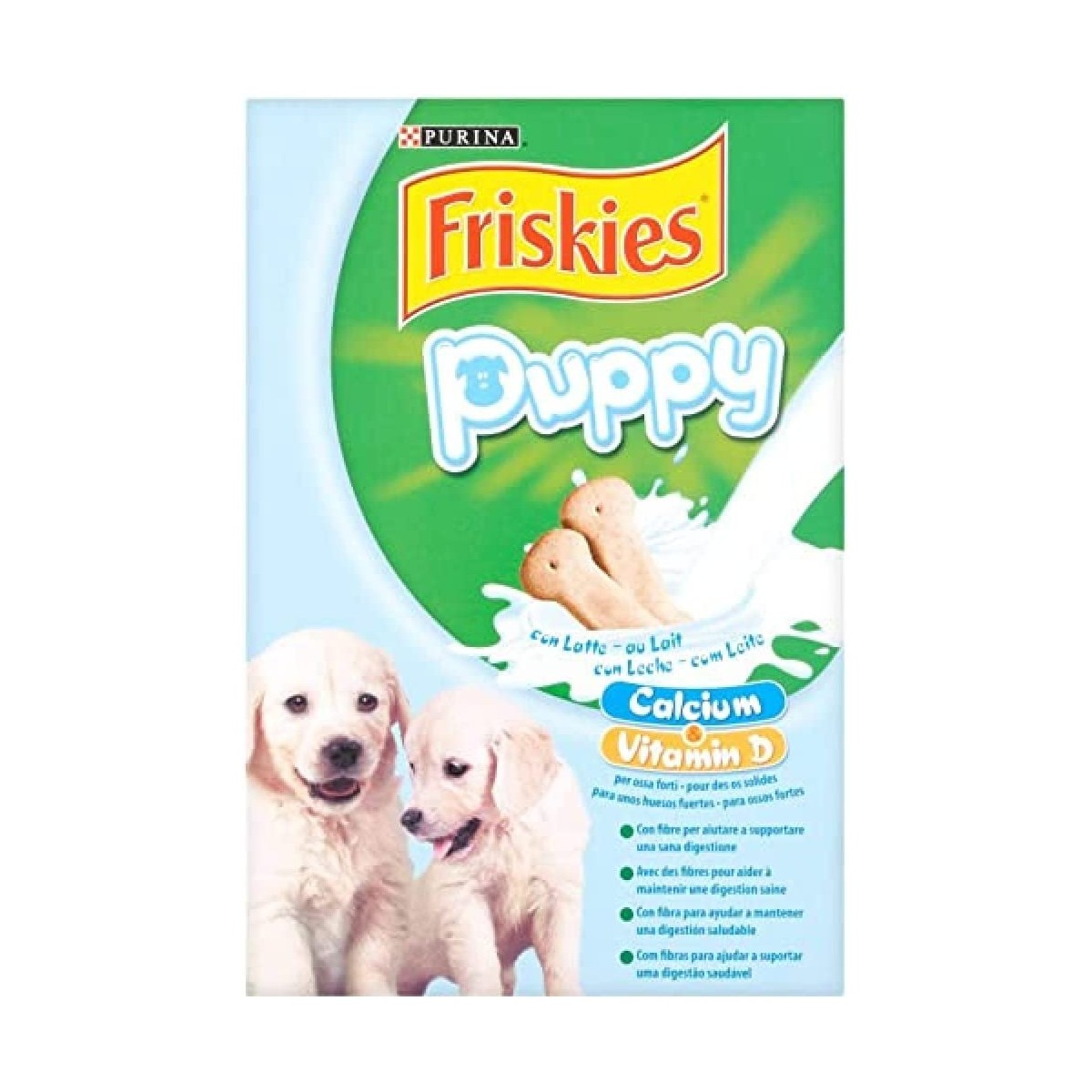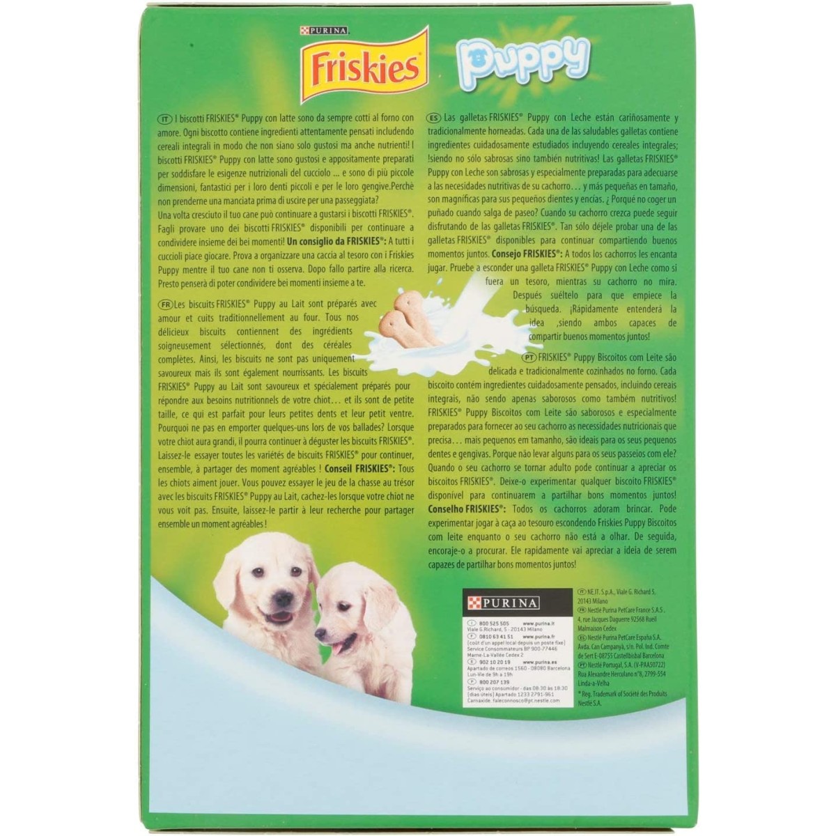 I biscotti secchi Friskies Biscuit Puppy Milk di Purina sono lo spuntino ideale per il tuo cucciolo di cane. Preparati con particolare attenzione alle esigenze nutrizionali della fase di sviluppo e crescita di ogni cucciolo, sono arricchiti con calcio e vitamina D, elementi validi per rafforzare le ossa e il sistema immunitario e cereali integrali che apportano un'alta percentuale di fibre, utili per agevolarne la digestione. Il sapore delicato del latte li rende una coccola affettuosa per condividere momenti di dolcezza insieme. I Biscuit Puppy Milk di Friskies vengono cotti al forno e mantengono il caratteristico aroma e la croccantezza del classico biscotto. Uno snack semplice e gustoso in una pratica confezione da 350 g. Questo prodotto non sostituisce un pasto, integrato ad una sana alimentazione mantiene in buona salute il tuo cane.