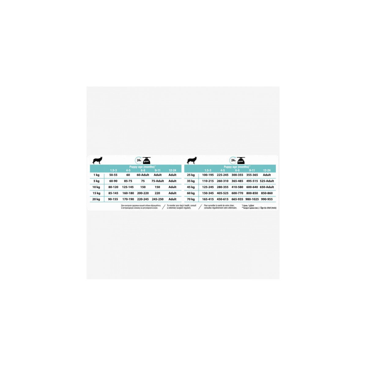 Razione giornaliera raccomandata: peso corporeo: 1.5-3 mesi - quantità: 4-5 mesi - quantità: 6-8 mesi - quantità: 9-11 mesi - quantità: 12-24 mesi - quantità: 1 kg 50-55 g 60 g 60-adulto 5 kg 60-90 g 85-75 g 75 g 75-adulto 10 kg 80-120 g 125-145 g 150 g 150 g adulto 15 kg 85-145 g 160-180 g 200-220 g 220 g adulto 20 kg 90-155 g 170-190 g 220-245 g 245-250 g adulto 25 kg 100-195 g 225-245 g 300-355 g 355-365 g adulto 35 kg 110-215 g 260-310 g 365-485 g 495-515 g 525-adulto 45 kg 125-245 g 280-355 g 410-580 g 600-640 g 650-adulto 60 kg 150-345 g 405-525 g 600-770 g 800-850 g 850-860 g 70 kg 165-415 g 450-615 g 665-935 g 980-1.025 g 990-955. Modalità d'uso: gravidanza e allattamento: visitate il sito web purina pro plan o chiedete al vostro medico veterinario per maggiori dettagli. Svezzamento e crescita: durante lo svezzamento, dalle 3 alle 6 settimane di età, offrire purina pro plan puppy inumidito 3 o 4 volte al giorno. Dopo lo svezzamento, somministrare le quantità sulla base delle linee guida presenti nella tabella. A partire dai 3 mesi ridurre gradualmente la quantità di acqua aggiunta. Per un sano sviluppo assicurarsi che il cucciolo mantenga una condizione corporea snella durante la crescita. Adattare le quantità di cibo giornaliere in più o in meno a seconda del livello di attività, della condizione fisica e dei bisogni individuali del cucciolo. Lasciare sempre a disposizione acqua pulita e fresca. Per tenere sotto controllo la salute del vostro cucciolo consultare regolarmente un medico veterinario