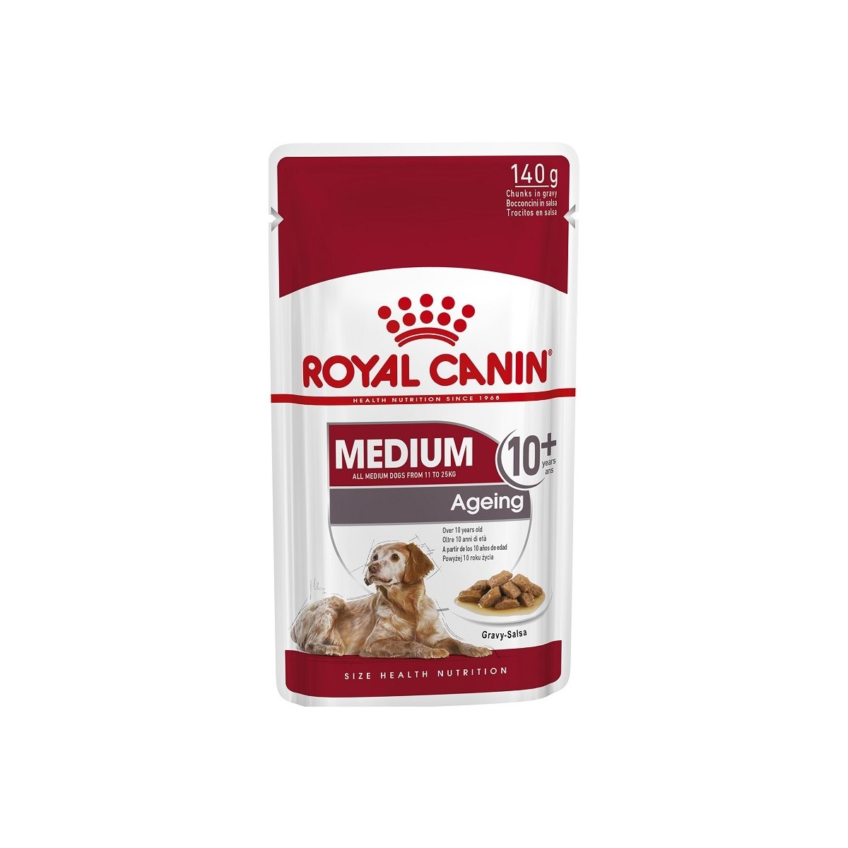 Royal Canin Medium Ageing è un cibo umido a base di succulenti bocconcini di carne in saporita salsa, specifico per favorire la vitalità del cane di taglia media nell'età matura.