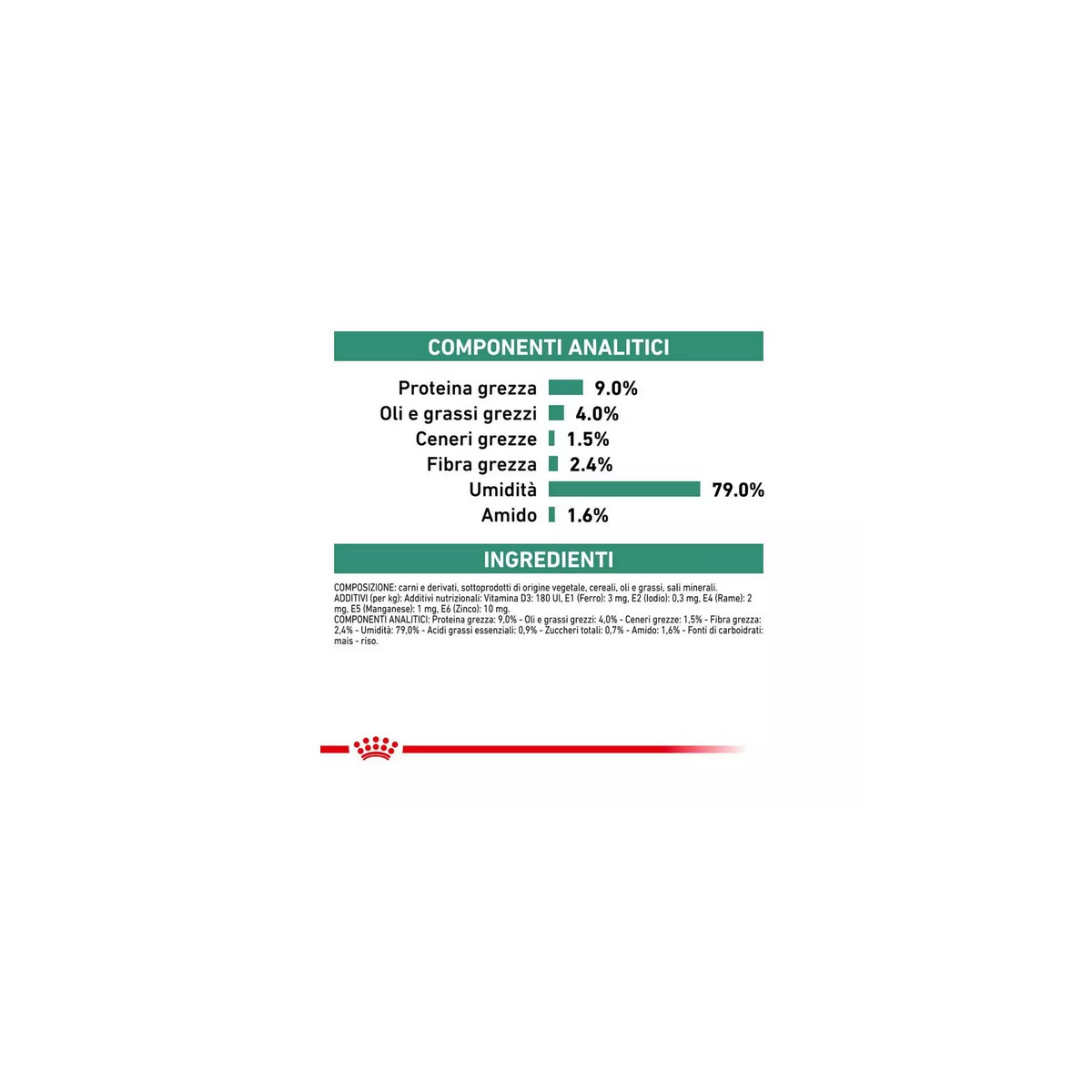 COMPONENTI ANALITICI: Proteina grezza 9%, Oli e grassi grezzi 4%, Ceneri grezze 1,4%, Fibra grezza 2,5%, Umidità 80%, Acidi grassi essenziali omega-6 0,7% ed omega-3 0,025%, Zuccheri totali 0,7%, Amido 1,6%, Carboidrati 3,1%.