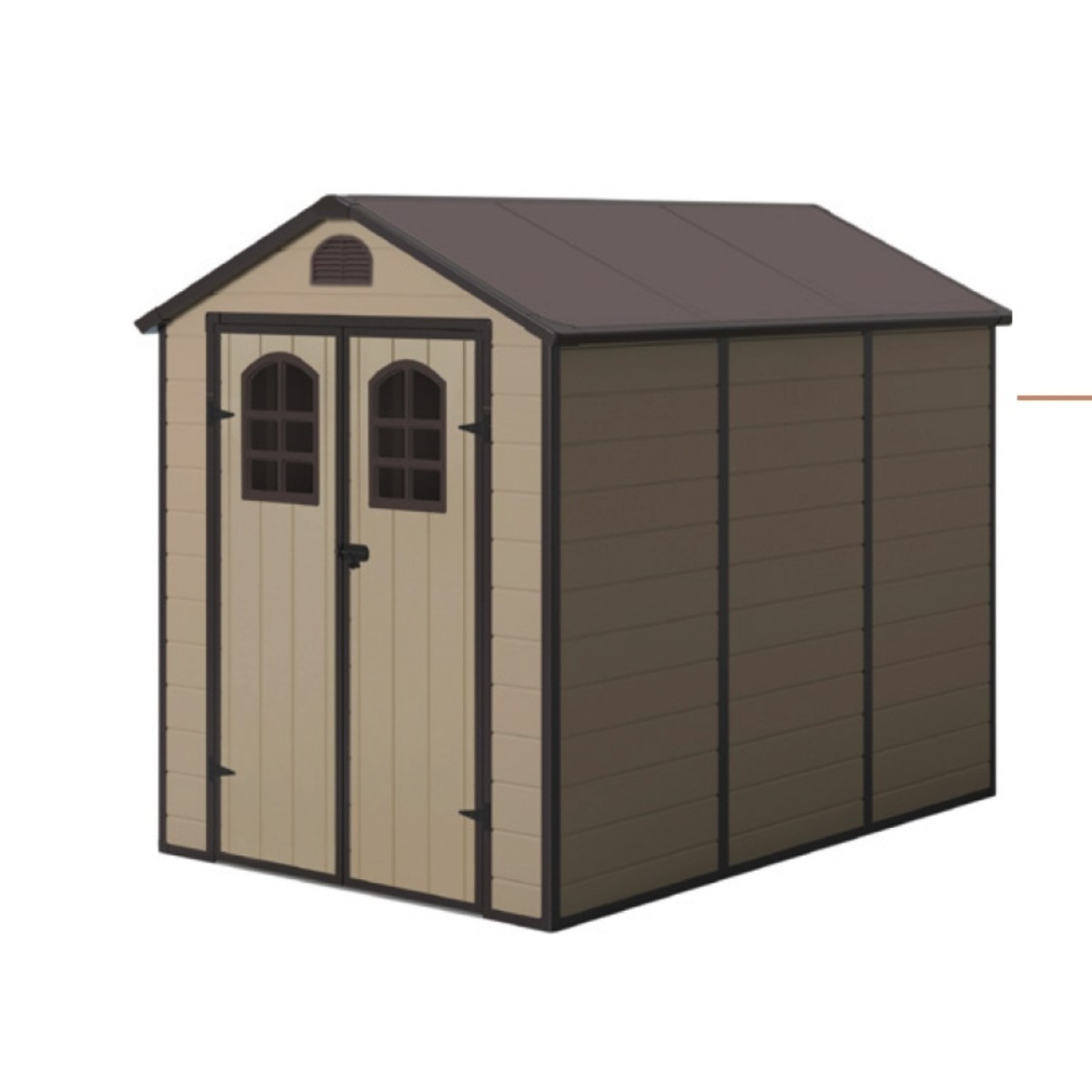 Casetta in resina che si integra perfettamente negli spazi più remoti del giardino, ospitando agevolmente tutti gli attrezzi, gli arredi o biciclette.