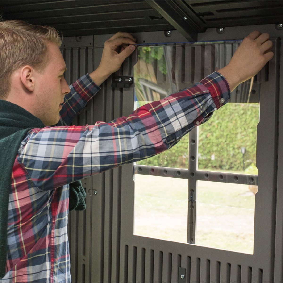 Casetta in polietilene alta densità a doppia parete (HDPE). Colore grigio con venature effetto legno, finitura spazzolata ruvida. Tetto realizzato con capriate in acciaio e dotato di lucernario a tutta lunghezza. Porta rinforzata con componenti acciaio; chiusura