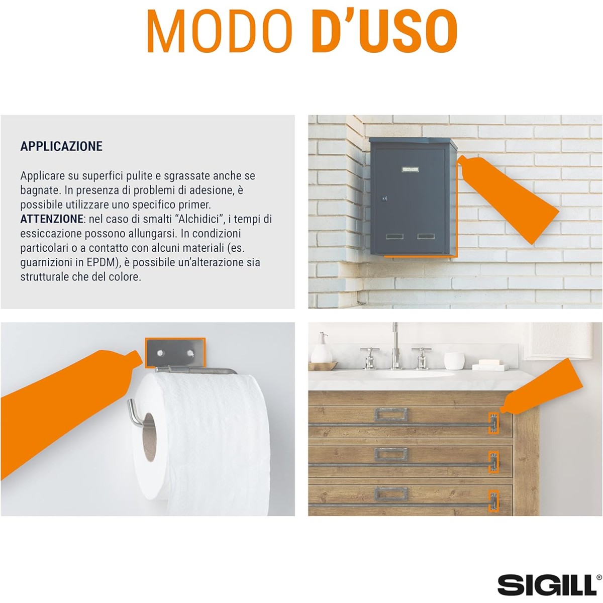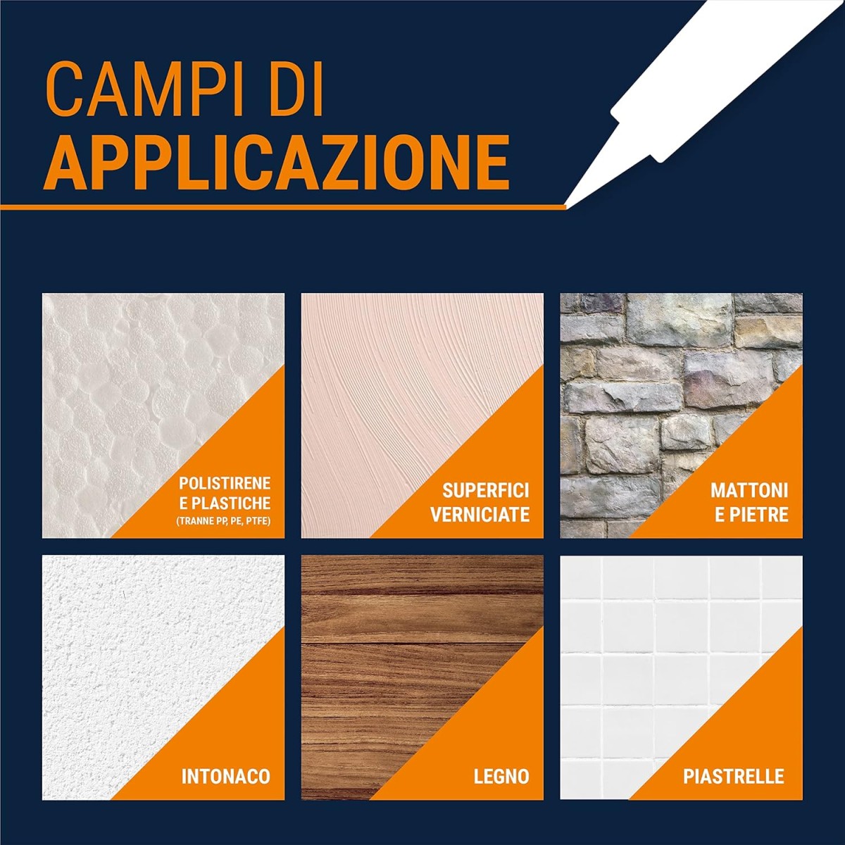 Adesivo di ultima generazione caratterizzato da un forte potere adesivo immediato (effetto ventosa),indicato per esterni ed interni,non teme l'umidità e le condizioni estreme.Colore bianco. Rimane elastico una volta idurito ed è verniciabile. Tenuta eccezionale 320 Kg/10 cmq. Ideale per lavori quotidiani di fai da te per incollare: specchi, soglie, davanzali, battiacopa, portasaponi, pannelli, cassette delle lettere, piastrelle, canalette elettriche, materiali da isolamento, ecc. Sostituisce l'uso di chiodi e tasselli evitando di forare. Incolla anche su superfici bagnate. A forte tenuta su tutti i materiali: legno, intonaco, mattoni, pietre, vetro, piastrelle, metalli, superfici verniciate, polistirolo e plastiche (No PP, PE, PTFE)