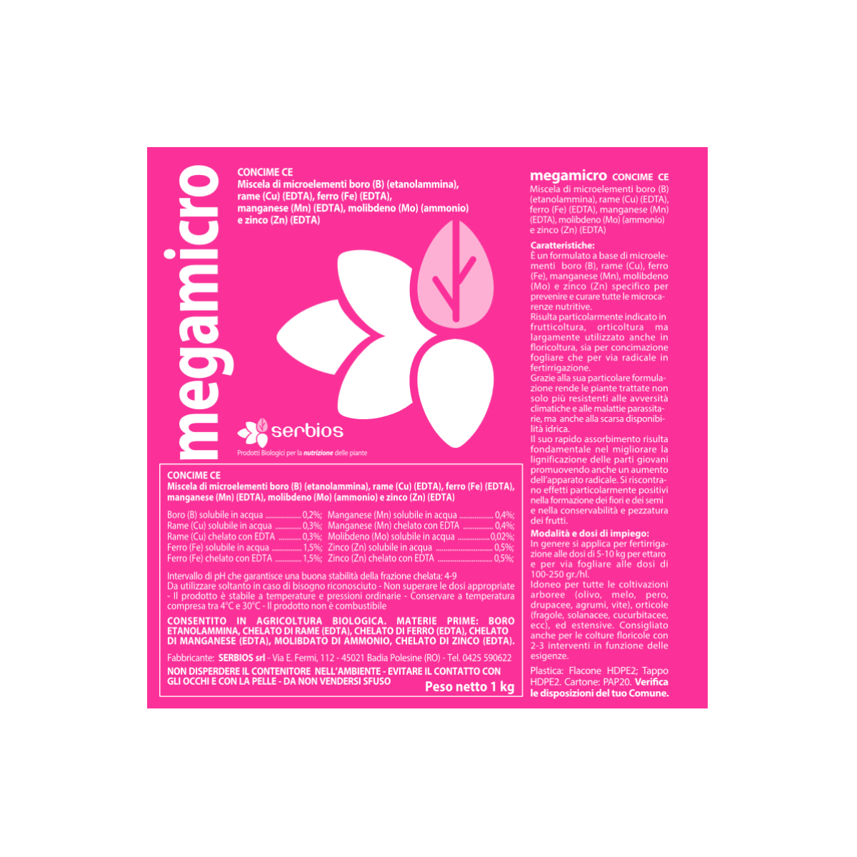 È un formulato a base di microelementi chelati, Boro (B), Rame (Cu), Ferro (Fe), Manganese (Mn), Molibdeno (Mo) e Zinco (Zn), specifico per prevenire e curare tutte le microcarenze nutritive. Risulta particolarmente indicato in frutticoltura e orticoltura ma viene largamente utilizzato anche in floricoltura, sia per concimazione fogliare che per via radicale in fertirrigazione. Grazie alla sua particolare formulazione, rende le piante trattate più resistenti non solo alle avversità climatiche e alle malattie parassitarie, ma anche alla scarsa disponibilità idrica. Il suo rapido assorbimento risulta fondamentale nel migliorare la lignificazione delle parti giovani, promuovendo anche un aumento dell’apparato radicale. Si riscontrano effetti particolarmente positivi nella formazione dei fiori e dei semi e nella conservabilità e pezzatura dei frutti.