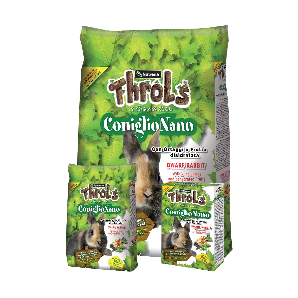 Nutrena ha ideato Throls Conigli Nani, un alimento completo e bilanciato, composto da una ricca varietà di ingredienti (semi, pellet, estrusi, cereali fioccati, frutta e verdura disidratata), per garantire un’alimentazione sana ed equilibrata ai conigli nani. Integrato con vitamine A, D3 ed E, favorisce un’ottima funzionalità intestinale e digestiva e garantisce benessere e salute. I differenti ingredienti di questo prelibato menù stimolano l’appetito e la masticazione dei coniglietti e li aiutano a mantenere i denti sani.