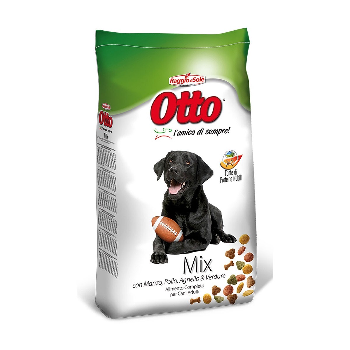 Otto Mix è una miscela di crocchette di diversa forma e dimensione, formulate con carni di pollo, agnello e manzo – nobili fonti di proteine animali – e verdure, come piselli e legumi, fonti privilegiate di proteine vegetali, vitamine e minerali. Otto Mix è formulato da Raggio di Sole per assicurare quotidianamente un pasto completo al tuo cane, fornendogli attraverso questa appetitosa e gustosa ricetta tutti i nutrimenti, le fibre, le vitamine e i minerali necessari per il suo benessere e la sua vitalità. Otto Mix: un menù ricco ed appetitoso per ogni giorno! Per cani di taglia piccola
