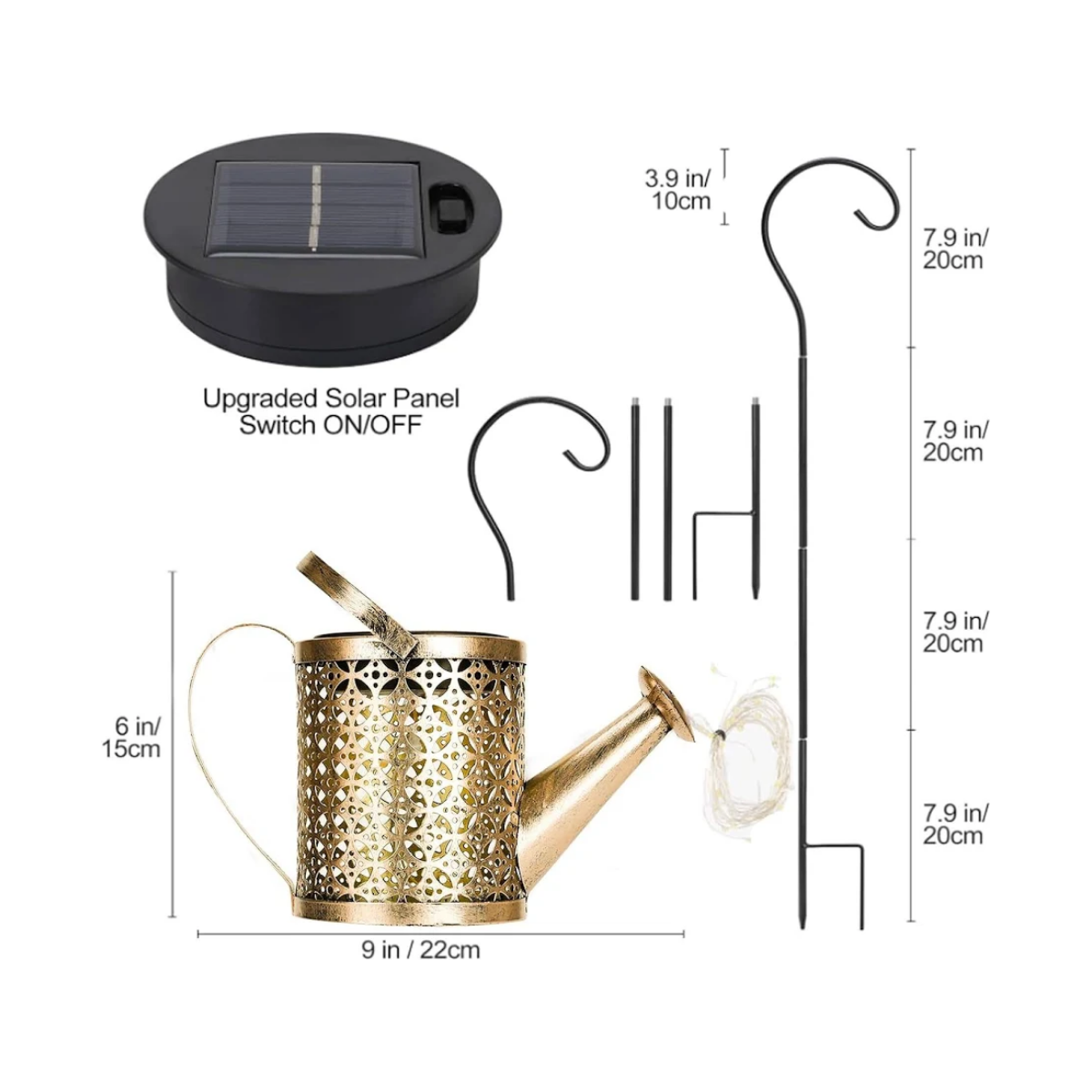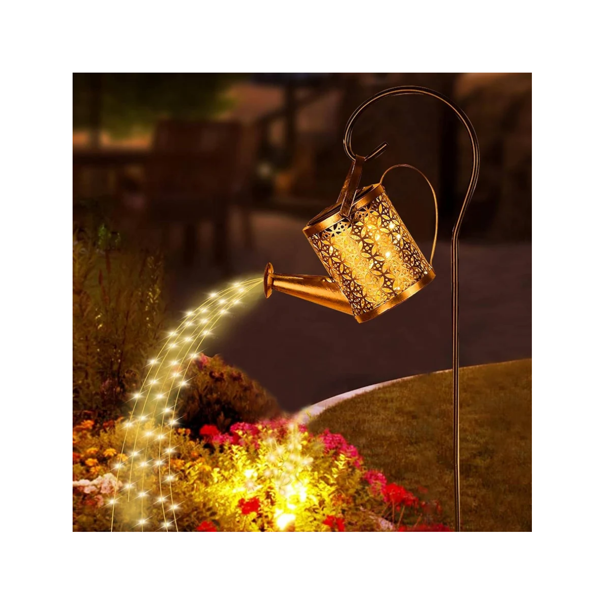 Ricarica solare e temporizzazione: pannello solare in polisilicio ad alta capacità con interruttore automatico. Finché l'interruttore è acceso durante il giorno, l'annaffiatoio solare assorbe automaticamente l'energia solare. Si accende automaticamente di notte. Il tempo di illuminazione è da 6 a 12 ore, con controllo intelligente della luce, risparmio energetico, eliminazione delle bollette elettriche e nessun cablaggio richiesto. La batteria da 600 mAh è sostituibile. Impermeabilità IP65 migliorata: la luce dell'annaffiatoio solare è realizzata in ferro e resina (la resina aumenta la flessibilità). Lo strato esterno è rinforzato con un rivestimento antiruggine, atossico ed ecologico e viene fornito con un supporto rimovibile preassemblato (82 cm). Con un grado di impermeabilità IP65, non c'è bisogno di preoccuparsi di pioggia, neve, gelo o grandine; è la scelta ideale sia per uso interno che esterno. Design unico e 36 LED lampeggianti: le lanterne per annaffiare sono completamente rinnovate e anche il corpo si illumina. Design in metallo cavo per abbellire il tuo giardino. La luce solare decorativa funziona bene quando si illumina al buio. Sei fili luminosi a lampeggio rapido, con 36 LED bianco caldo ad alta luminosità collegati a fili di rame, e le perle luminose lampeggianti imitano realisticamente l'effetto dell'acqua che scorre, offrendoti un'esperienza visiva unica.