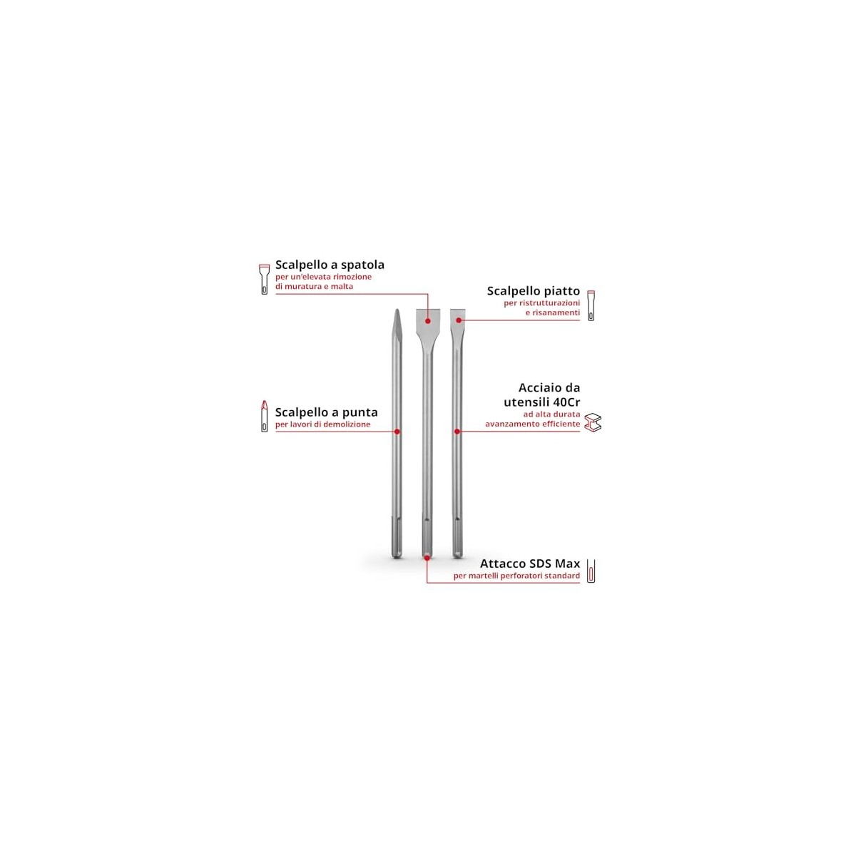 - Soluzione all-in-one - Il set di scalpelli da 3 pezzi contiene le forme di scalpello più importanti per i lavori di demolizione e ristrutturazione.