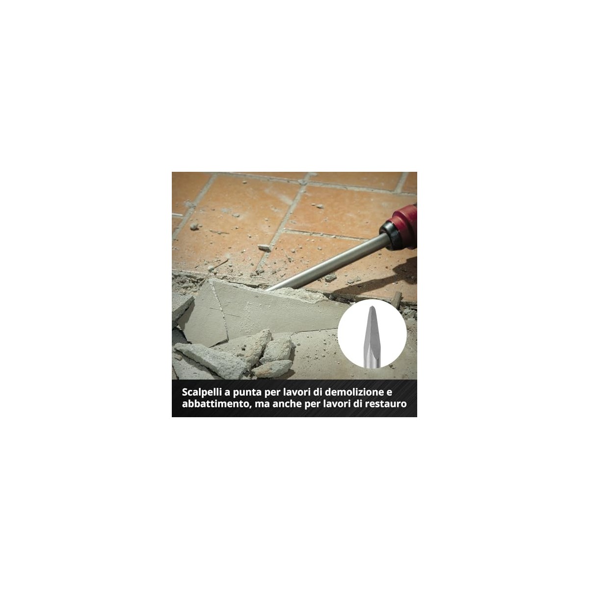 - Scalpello a punta - Lo scalpello a punta in acciaio 40Cr con una lunghezza di 400 mm è ideale per i lavori di demolizione e abbattimento.
