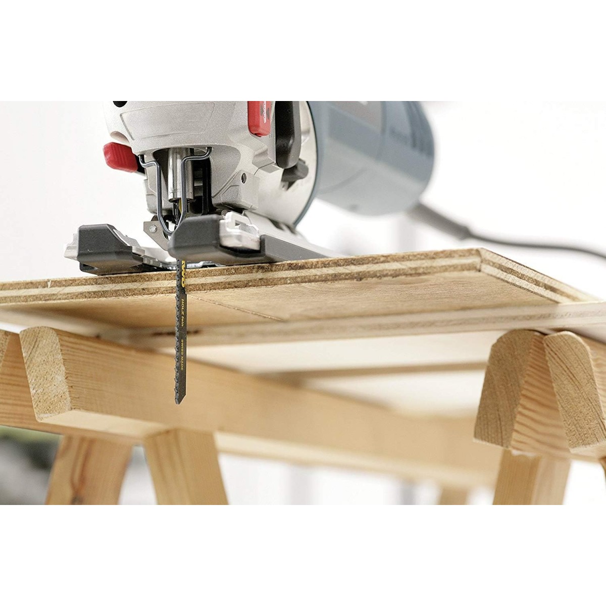 Le 6 lame per seghetto da legno sono adatte per pannelli fino a 50 mm di spessore. Sono complementari 2 lame per seghe metalliche HSS per la lavorazione di lamiere sottili: I denti sono induriti e corrugati e fresati per il taglio libero.