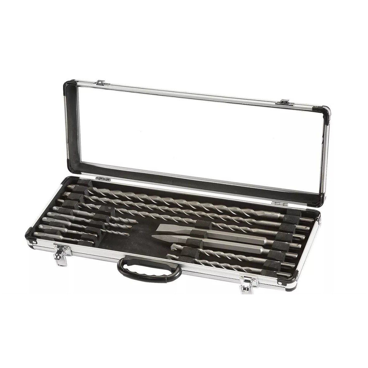 10 punte a martello (1 pezzo Ø 5 x 110 mm, 1 pezzo Ø 6 x 110 mm, 1 pezzo Ø 6 x 160 mm, 1 pezzo Ø 8 x 160 mm, 1 pezzo Ø 10 x 160 mm, 1 pezzo Ø 10 x 210 mm , 1 pezzo Ø 12 x 210 mm, 1 pezzo Ø 10 x 450 mm, 1 pezzo Ø 12 x 450 mm, 1 pezzo Ø 16 x 450 mm) 1 pezzo scalpello a punta (250 mm di lunghezza) 1 pezzo scalpello piatto (250 mm di lunghezza),