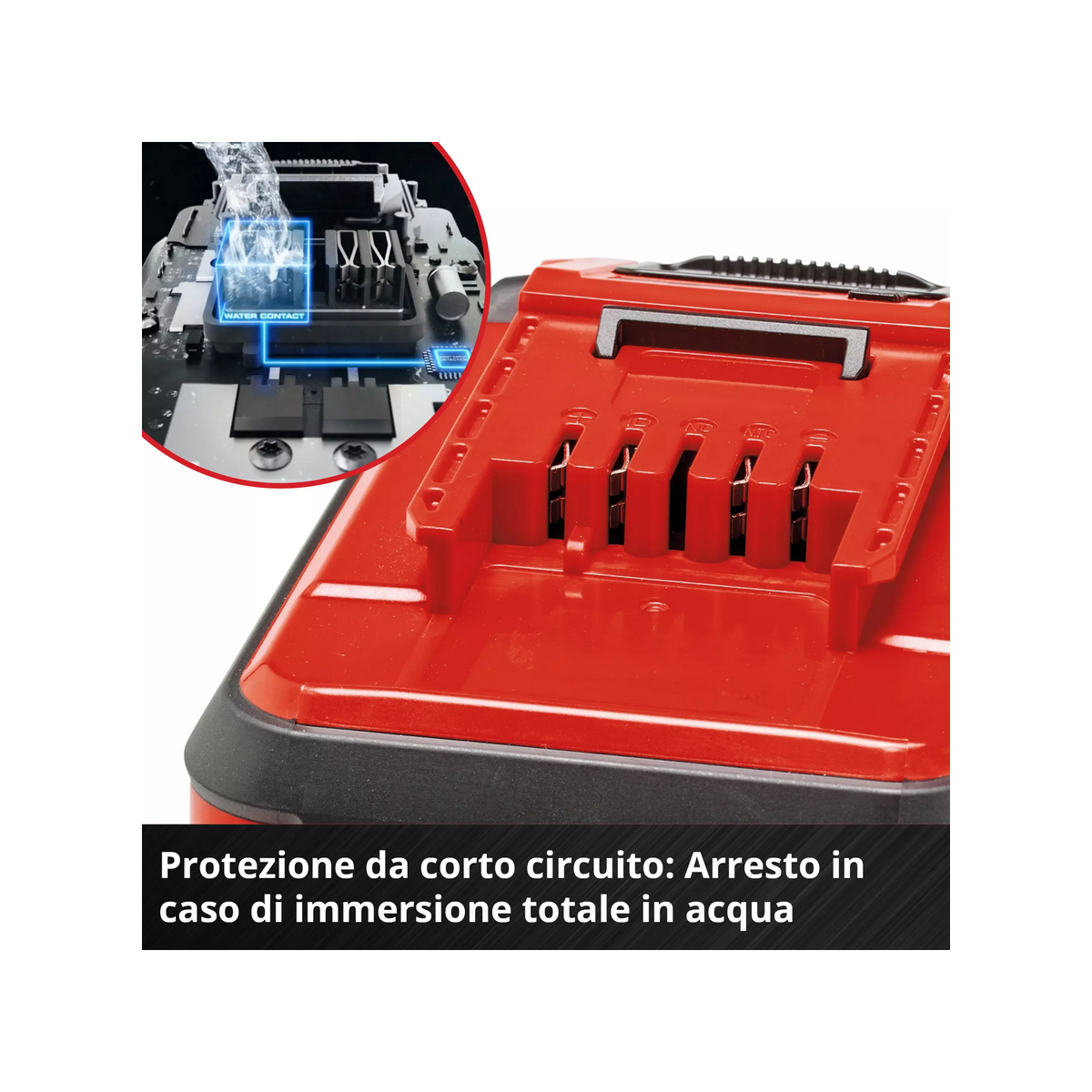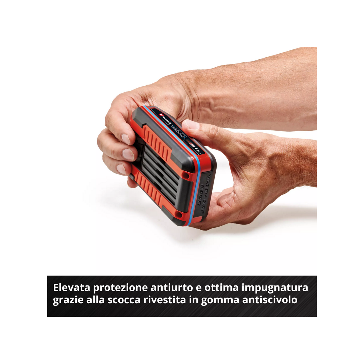 La Einhell 18 V 4,0 Ah SEALED Power X-Change PLUS appartiene al sistema di batterie multifunzionali e illimitatamente combinabili Power X-Change di Einhell. Le batterie universali Power X-Change forniscono energia e resistenza a tutti gli apparecchi a batteria dell'intera famiglia di prodotti da giardino e officina. Quale particolarità ha la batteria SEALED? La scocca sigillata la rende resistente all'acqua e alla polvere secondo la classe di protezione IP57. Il fusibile di cortocircuito integrato su contatto aggiuntivo nell'alloggiamento della batteria dispone di sensore che rileva il contatto con l'acqua e spegne l'elettronica. Si garantisce così che la batteria, una volta asciutta, possa essere riutilizzata anche dopo la completa immersione in acqua. Le sue batterie agli ioni di litio di ultima generazione forniscono il 100% di potenza in più per la massima forza in tutte le applicazioni, insieme a un design più compatto del 13 % e riduzione del peso del 10 %. Inoltre, la tecnologia PLUS è sinonimo di potenza extra durante i lavori ad alte prestazioni. La batteria di alta qualità resiste anche all'effetto memoria e alla normale autoscarica della batteria per un'alta potenza costante. La batteria PXC PLUS 18 Volt,4,0 Ah appartiene alla gamma alta della famiglia Power X-Change ed è adatta anche per l'uso TWIN-PACK in apparecchi da 36 V. Il sistema di gestione della batteria attivo e controllato dal processo ABS monitora costantemente i parametri della batteria utilizzando il microprocessore, Di conseguenza, garantisce massima sicurezza, prestazioni ottimali del dispositivo, massima autonomia e massima durata. Lo stato di carica attuale può essere controllato da un display a LED a 3 livelli. Grazie alla forma, la scocca resiste a polvere, corrosione e sollecitazioni meccaniche. Il rivestimento in gomma offre alla batteria una resistenza elevata agli urti e una buona presa. Utilizzando l'impugnatura incassata, può essere facilmente rimossa da tutti i dispositivi.