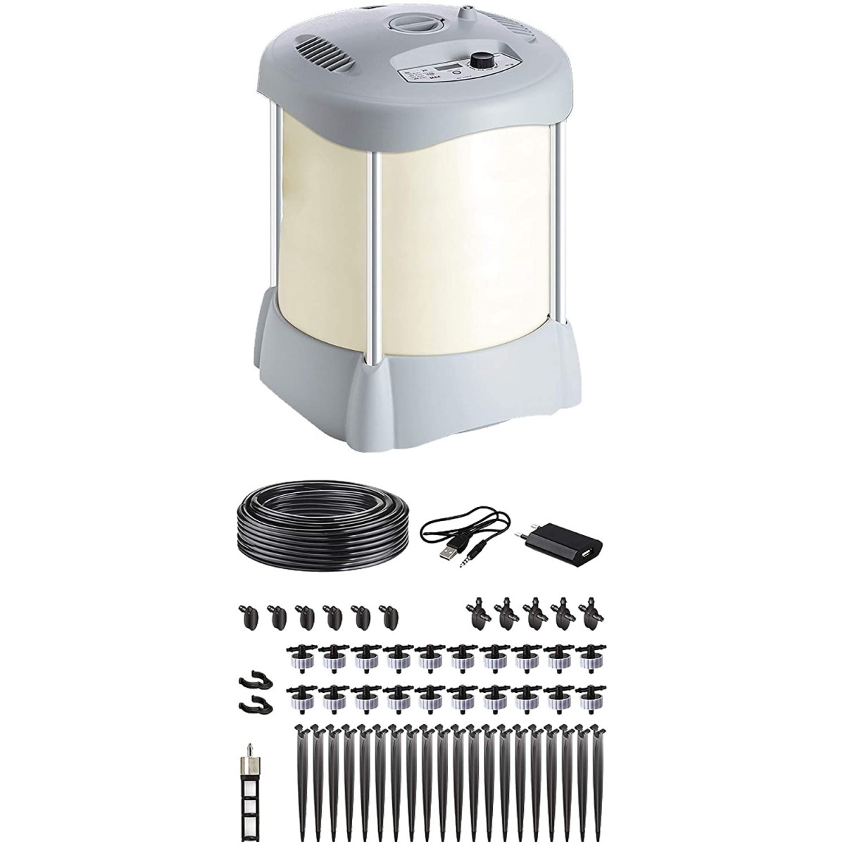 Adatto sia per le piante da interno che per terrazzi e balconi. Il sistema può essere alimentato a corrente elettrica tramite adattatore di rete con presa USB incluso, oppure da 2 pile ricaricabili AA 1.2V NiMH da minimo 2000 mAh (non fornite). Serbatoio d’acqua pieghevole in PVC di grande spessore con capienza 30 litri. Comoda apertura superiore per il riempimento. Montaggio senza attrezzi dei montanti di supporto. Quattro diversi programmi (7-14-21-28 giorni di autonomia), selezionabili con una comoda manopola. Pulsante “start” per partenza immediata del programma o ritardata fino a 23 ore. Il display LCD retroilluminato permette di visualizzare il programma selezionato, la durata del ciclo di irrigazione in corso, l’eventuale ritardo impostato e il tempo che manca all’irrigazione successiva.