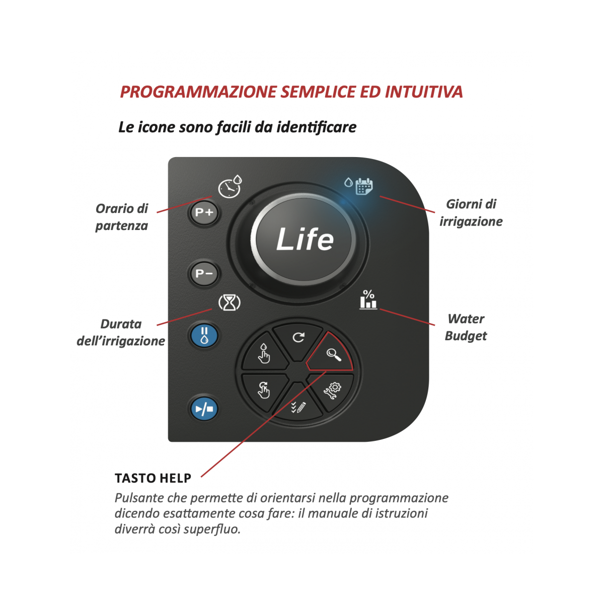 Con la LIFE ™ PLUS è inoltre possibile controllare e programmare l’irrigazione del proprio giardino in qualunque momento e in qualsiasi luogo ci si trovi, aggiungendo il modulo Wi-Fi opzionale e scaricando l’App Life sul proprio cellulare.