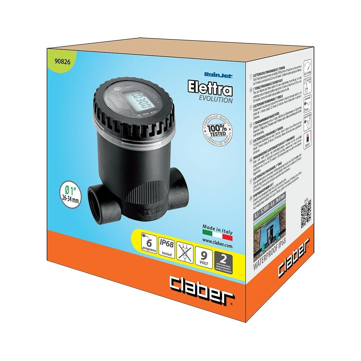 La Claber ELETTRA BT è un'elettrovalvola programmabile da 1", progettata per gestire una linea di irrigazione in modo semplice e completamente digitale. Può essere installata direttamente sul rubinetto oppure su una presa d’acqua in pozzetto. Il coperchio a perfetta tenuta stagna con certificazione IP68 consente il funzionamento anche in totale immersione.