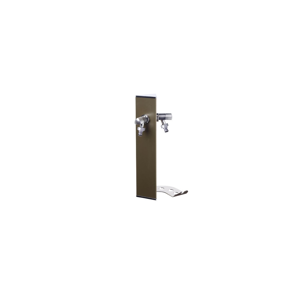 Colonnina idrica triangolare da giardino in alluminio verniciato a polveri poliestere antigraffio, completa di due rubinetti e sella portatubo in acciaio inox. La staffa portatubo è compresa.