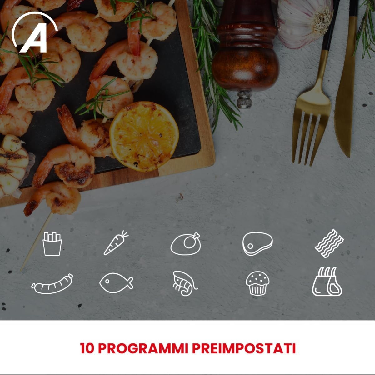 CAPIENZA E TEMPERATURA - Questa friggitrice ad aria Ardes ha capienza di 8 litri e temperatura regolabile da 60 a 200 °C per cuocere alla griglia, friggere e arrostire. è profonda il 35% in più delle friggitrici tradizionali. Ideale per 6-8 persone, permette di preparare abbondanti e gustose porzioni