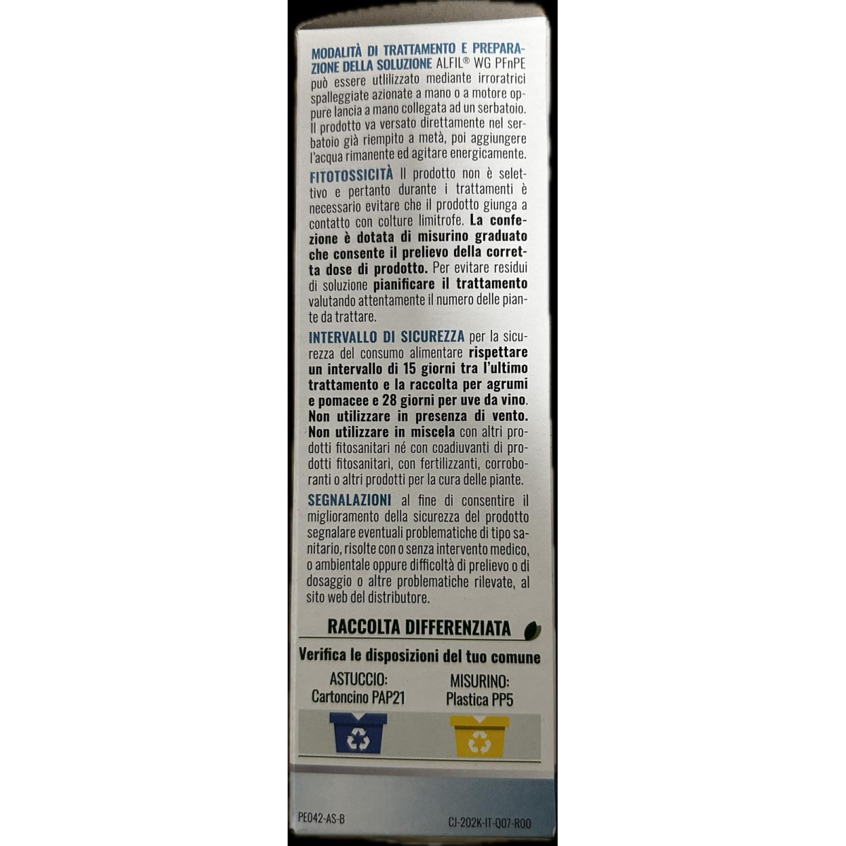 ANTIPERONOSPORICO SISTEMICO ALFIL WG PFnPE è un fungicida sistemico in granuli idrodispersibili la cui efficacia è garantita anche dalla sua grande mobilità nelle piante. Penetra rapidamente nei tessuti vegetali, per cui non presenta rischi collegati al dilavamento, e manifesta una sistemia ascendente e discendente che consente anche la protezione delle foglie formatesi dopo il trattamento. IMPIEGHI AUTORIZZATI E MODALITÀ D'USO: AGRUMI (Arancio, Limone, Pompelmo, Limetta, Mandarino, Clementino, Pomelo, Bergamotto, Cedro, Tangerino, Chinotto, Arancio Amaro, Mapo, Tangelo): contro Phytophtora spp. effettuare irrorazioni fogliari (max 3 trattamenti per anno) alla dose di 37,5 g di prodotto, distribuiti con 15 litri di acqua, per 100 m2 (corrispondenti a 2,5 g di prodotto per litro d'acqua). Il dosaggio può essere aumentato fino ad un massimo di 45 g di prodotto per 100 m2 (corrispondenti a 3 g di prodotto per litro d'acqua) in caso di forte pressione della malattia. Il primo trattamento deve essere effettuato in primavera all'inizio della fioritura, il secondo a luglio ed il terzo a ottobre/novembre. Nel caso di piante debilitate dalla malattia, il cui apparato fogliare non è più in grado di assorbire bene il prodotto, è opportuno integrare le applicazioni fogliari con "pennellature" della stessa soluzione (2,5-3 g di prodotto per litro d'acqua) sulle zone infette del tronco e delle branche. VITE DA VINO: contro Plasmopara viticola effettuare max 4 trattamenti per anno alla dose di 25 g di prodotto, distribuiti con 10 litri di acqua, per 100 m2 (corrispondenti a 2,5 g di prodotto per litro d'acqua). Il dosaggio può essere aumentato fino ad un massimo di 30 g di prodotto per 100 m2 (corrispondenti a 3 g di prodotto per litro d'acqua) in caso di forte pressione della malattia. Iniziare gli interventi in pre-fioritura e proseguirli ad intervalli di 10-14 giorni in funzione delle condizioni climatiche e della pressione del patogeno. POMACEE: contro Phytophtora spp. effettuare max 3 trattamenti per anno alla dose di 25 g di prodotto, distribuiti con 10 litri di acqua, per 100 m2 (corrispondenti a 2,5 g di prodotto per litro d'acqua). Il dosaggio può essere aumentato fino ad un massimo di 30 g di prodotto per 100 m2 (corrispondenti a 3 g di prodotto per litro d'acqua) in caso di forte pressione della malattia. Eseguire il primo trattamento ad aprile, il secondo a luglio ed il terzo a settembre/ottobre. MODALITÀ DI TRATTAMENTO E PREPARAZIONE DELLA SOLUZIONE ALFIL WG PFnPE può essere utlilizzato mediante irroratrici spalleggiate azionate a mano o a motore oppure lancia a mano collegata ad un serbatoio. Il prodotto va versato direttamente nel serbatoio già riempito a metà, poi aggiungere l'acqua rimanente ed agitare energicamente. FITOTOSSICITÀ - Il prodotto non è selettivo e pertanto durante i trattamenti è necessario evitare che il prodotto giunga a contatto con colture limitrofe. La confezione è dotata di misurino graduato che consente il prelievo della corretta dose di prodotto. Per evitare residui di soluzione pianificare il trattamento valutando attentamente il numero delle piante da trattare.