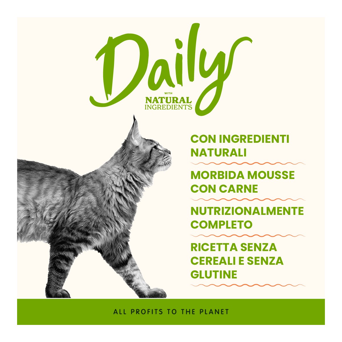 Le ricette Daily sono preparate con ingredienti naturali idonei al pet food: alimenti completi che soddisfano i gusti di tantissimi gatti adulti grazie alla varietà di ingredienti(carne, pesce e rigaglie). Con le ricette Daily si ha la certezza di proporre un’alimentazione con la garanzia di qualità Almo Nature, ad un prezzo ancora più conveniente! Tuttalagamma è priva di coloranti o conservanti chimici. La confezione in Tetra Recart® è facile da aprire, comoda da versare ed ha un ridotto impatto climatico rispettoadaltretipologie di packaging*. Contiene fino al 71% di carta certificata FSC® ed è riciclabile: se smaltita correttamente, può essere riutilizzata come materia prima per altri imballi.Daily – ricette grain free in mousse – è disponibile in comode confezioni monodose da 90 g e confezioni richiudibili da 380 g. Almo Nature è il brand attivista 100% proprietà della Fondazione Capellino.