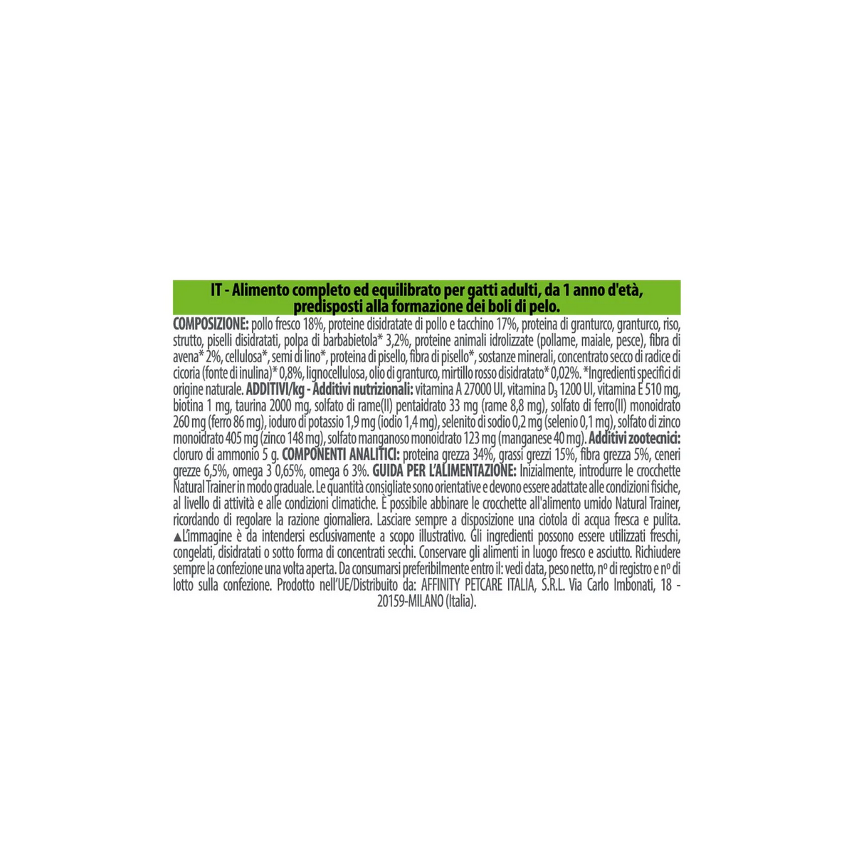 Natural Trainer Gatto Hairball Adult Pollo è un alimento secco completo e bilanciato progettato appositamente per gatti adulti, da 1 anno d'età, predisposti alla formazione dei boli di pelo.. Questo cibo secco è formulato per aiutare a ridurre la formazione di boli di pelo con la sua formula adattata ad alto contenuto di fibre e con un tipo specifico di fibre, come la fibra di avena, favorisce l'eliminazione dei peli con le feci. Questo alimento senza coloranti, conservanti e zuccheri aggiunti contiene il pollo come fonte di proteina animale di alta qualità e prebiotici di origine naturale, derivati dalla radice di cicoria e dalla polpa di barbabietola, favoriscono la funzionalità intestinale e il corretto equilibrio del microbiota intestinale. Questi componenti favoriscono la funzionalità digestiva, consentendo al tuo gatto di godere di pasti leggeri e facilmente digeribili. Per mantenere la pelle sana e il pelo lucido, questo alimento è arricchito con acidi grassi omega-3, omega-6, biotina e zinco. Questi nutrienti contribuiscono al benessere della pelle e alla bellezza del pelo del tuo gatto, mantenendolo sano e splendente. Inoltre, per preservare la salute delle vie urinarie del tuo felino, questo alimento contiene mirtilli rossi, estratto di radici di cicoria di origine naturale e livelli controllati di sostanze minerali.