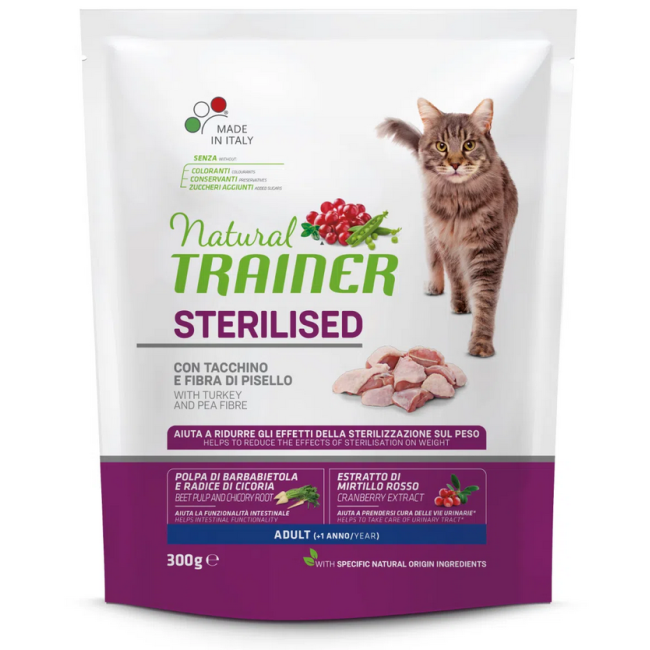 Trainer Natural Adult Sterilised con Tacchino e fibra di pisello è un alimento completo per gatti sterilizzati da un anno d’età che aiuta a ridurre gli effetti della sterilizzazione sul peso. Il cibo secco Trainer Natural aiuta a mantenere la perfetta forma fisica attraverso una nutrizione mirata a ridotto apporto calorico e realizzata con nobili proteine della carne fresca di tacchino. Favorisce la freschezza dell'alito grazie all'estratto di menta piperita e del propoli. Consente di cambiare gusto in totale sicurezza e favorisce una corretta digestione grazieai FOS, Prebiotici e Lievito di birra contenuti. Aiuta a preservare nel tempo la salute e la funzionalità delle vie urinarie attraverso le sostanze benefiche dell'estratto secco di mirtillo rosso.