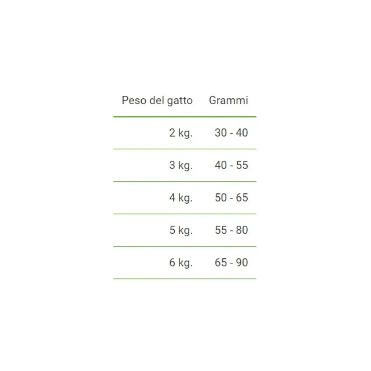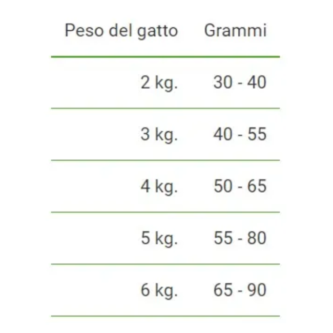 Modalità d'uso: vedere la tabella per le razioni giornaliere raccomandate. Queste quantità rappresentano solo delle linee guida. Per aiutare a mantenere il tuo gatto nella condizione corporea ideale, adattare le quantità di cibo giornaliere a seconda del livello di attività, condizione fisica e dei bisogni individuali del felino. Lasciare sempre a disposizione acqua pulita e fresca. Per tenere sotto controllo la salute del tuo gatto consultare regolarmente un veterinario.