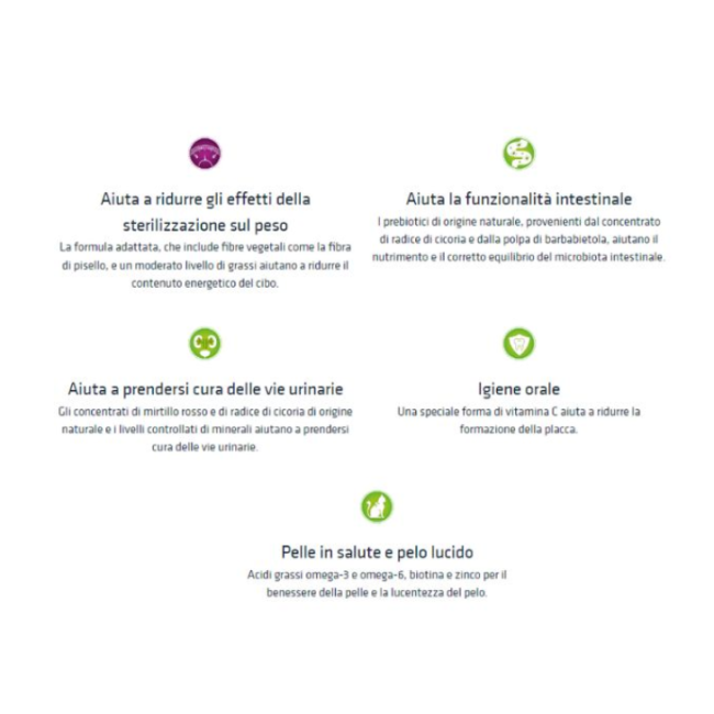 Composizione: Pollo fresco, riso, granturco, proteina di granturco, proteine disidratate di pollo e tacchino, proteine disidratate di prosciutto crudo 100% italiano 6,5%, fioretto di granturco, piselli disidratati 4%, proteine disidratate di maiale, proteine disidratate di salmone, proteine disidratate di manzo, fibra di pisello* 2,6%, proteine animali idrolizzate, polpa di barbabietola* 2,4%, grasso di origine animale, semi di lino*, sostanze minerali, estratto secco di radice di cicoria (fonte di inulina)* 0,7%, lievito di birra, olio di granturco, alghe (Schizochytrium spp.)*, estratto secco di mirtillo rosso* 0,02%. *Ingredienti specifici di origine naturale.