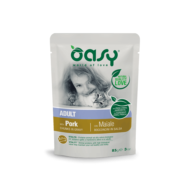 Teneri bocconcini con Maiale per deliziare il tuo gatto adulto, ogni giorno. Alimento preparato con tante proteine animali e prodotto senza glutine aggiunto, senza aromatizzanti e coloranti artificiali.