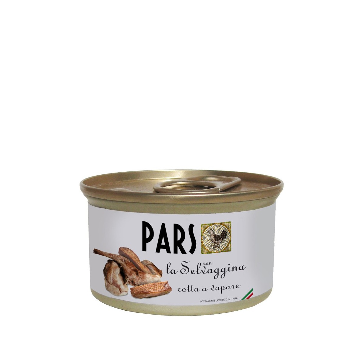 Mix di carni con l’aggiunta di selvaggina 10%; un pizzico di saccarosio e l’aggiunta di Vitamina E (antiossidante naturale). Proteina 10%, Grassi grezzi 6,1%, Fibre grezze 0,1%, Ceneri grezze 2,5%, Umidità 81,3%.