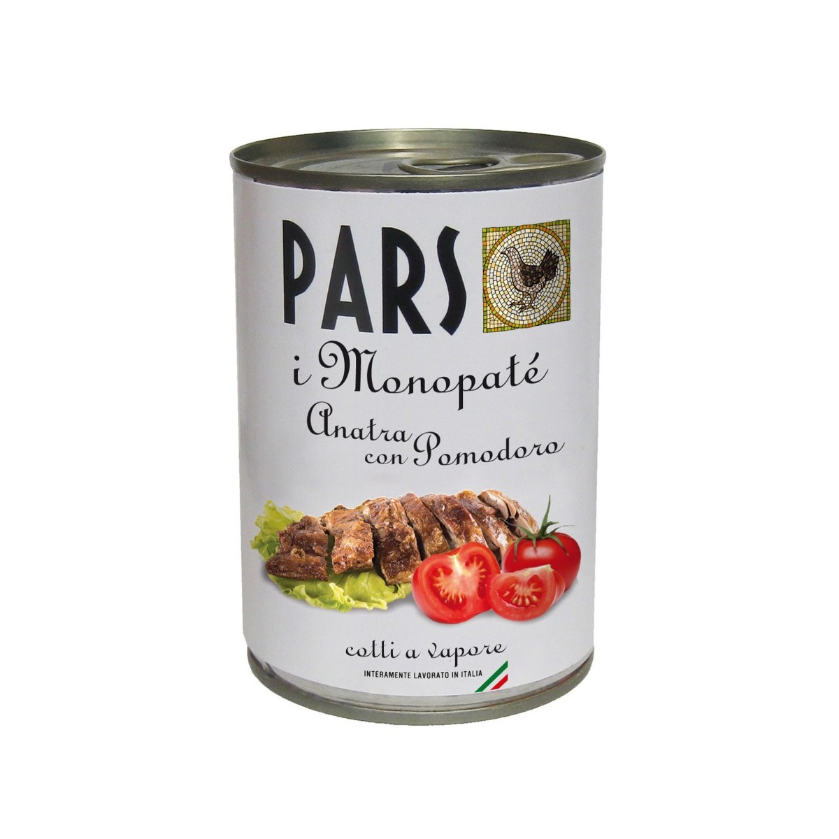 Carni “integrali” di anatra (100%) con un pizzico di pomodoro disidratato e di saccarosio e con l’aggiunta di alcune Vitamine e Minerali tra cui la Vitamina E (antiossidante naturale) e la Taurina (stimola il metabolismo e rafforza il sistema immunitario). Proteina 6,5%, Grassi grezzi 4,5%, Fibre grezze 0,5%, Ceneri grezze 2%, Umidità 81%.