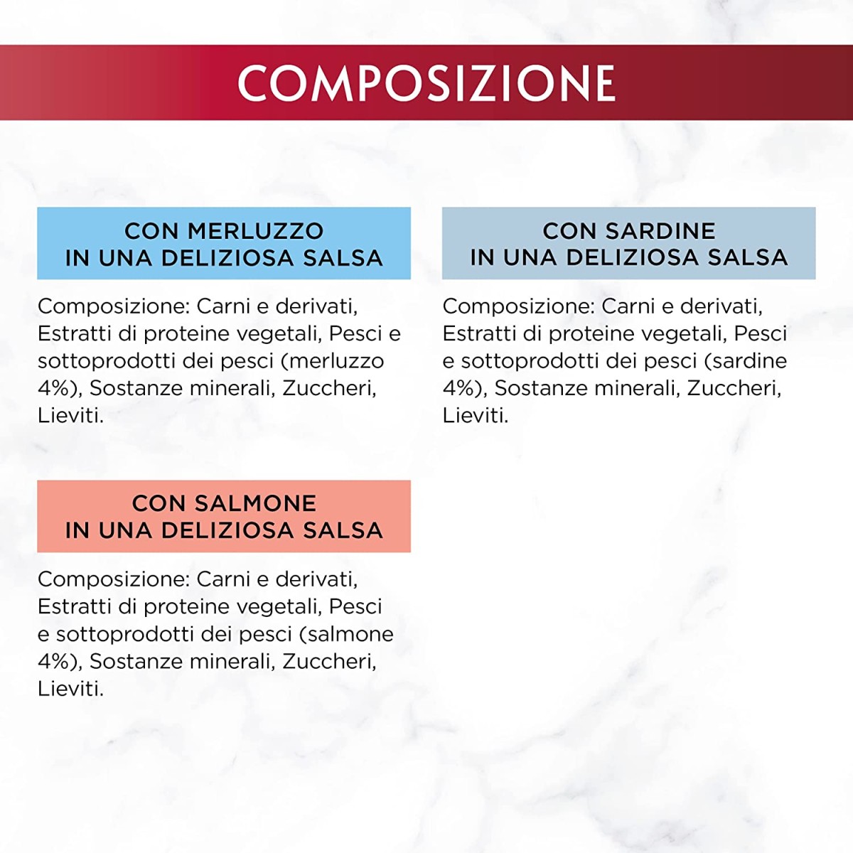 - Cibo per gatti Purina Gourmet Mon Petit Intense ricette con pesci in piccole porzioni. Selezione prelibata con carne di Merluzzo, Salmone e Sardine.
