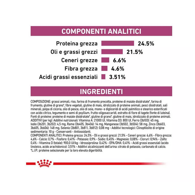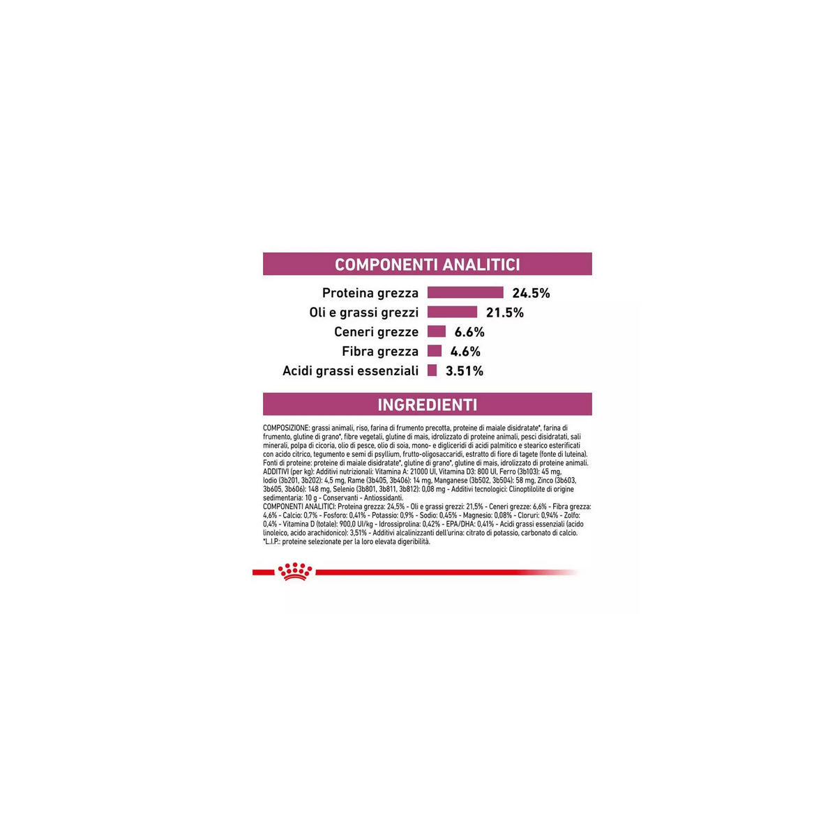 COMPONENTI ANALITICI: Proteina grezza: 24.5% - Oli e grassi grezzi: 21.5% - Ceneri grezze: 6.4% - Fibra grezza: 4,6% - calcio 0.7% - Fosforo 0.41% - Cloruro 0,91% - Potassio: 0,9% - Sodio: 0,45% -acidi grassi omega 3 0.95% - acidi grassi omega 6 3.56% - umidità 5.5%.