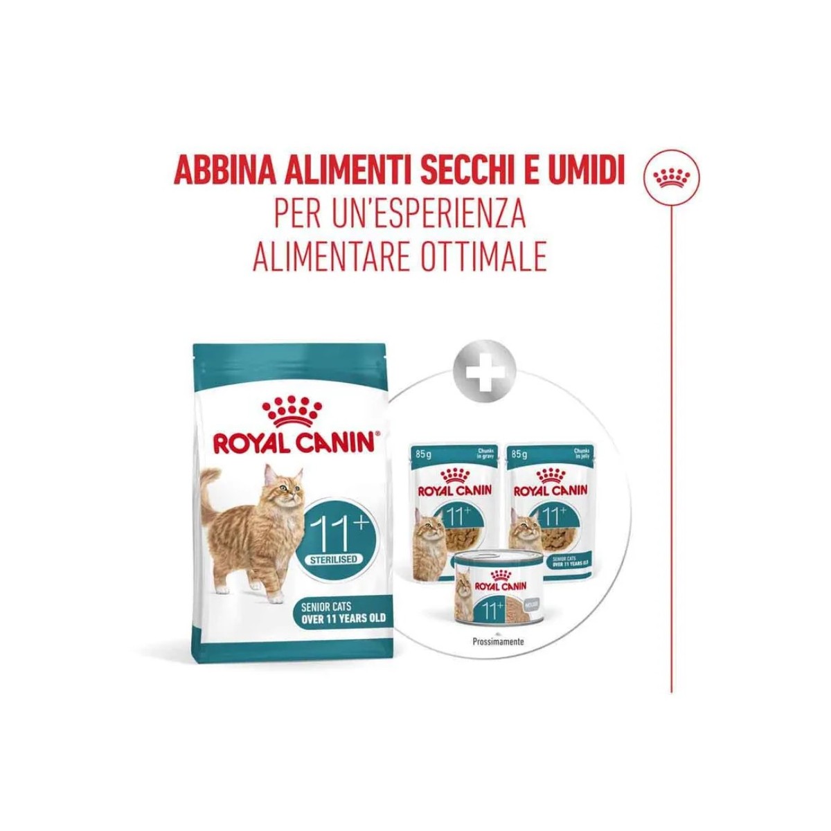 La speciale formula di Royal Canin Sterilised Ageing 11+ è stata studiata per sostenere le naturali funzioni renali, cerebrali e visive, nonché la pelle, il pelo e le difese immunitarie dei gatti anziani.