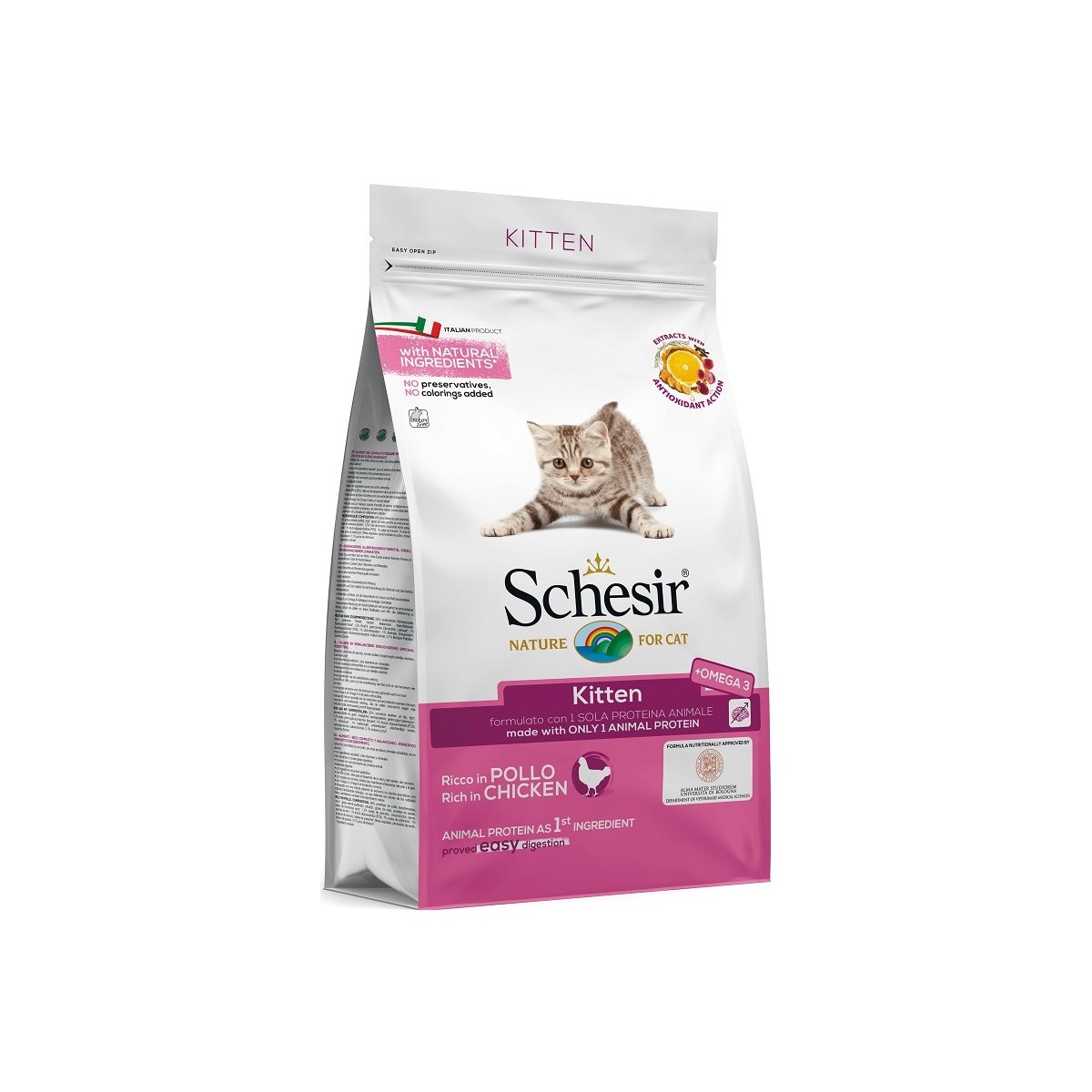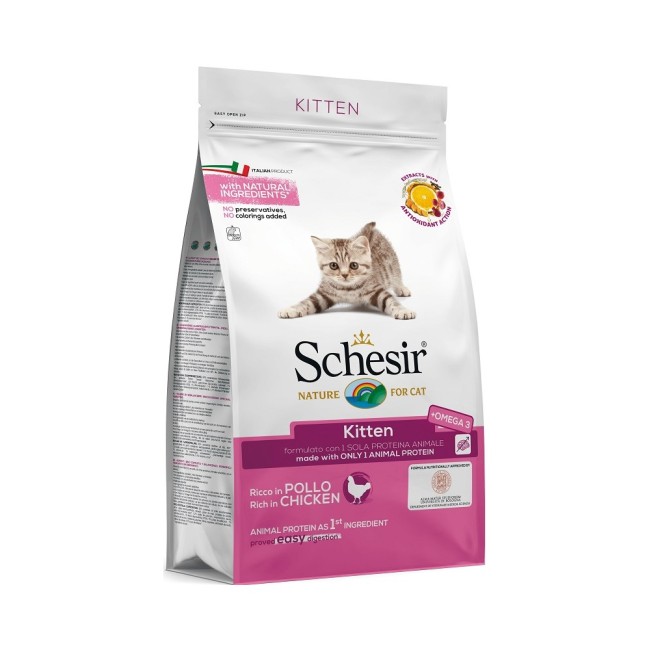 La gamma di crocchette Schesir Dry Line è formulata con un’unica fonte di proteine animali ed è ricca di ingredienti naturali*, con aggiunta di vitamine e minerali, per rispondere alle esigenze nutrizionali dei gattini in fase di accrescimento e per aiutarli a mantenere ottimali condizioni di benessere.