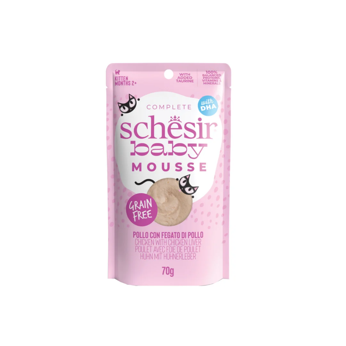Schesir Baby Pollo con fegatini di pollo Mousse gr.70. Cibo Per Cuccioli di gatto. Schesir ci aiuta a rendere felici i nostri gatti e cani attraverso l'alimentazione, perché è la scelta migliore per loro: ricette create per rispondere ai loro veri e specifici fabbisogni nutrizionali, a base di ingredienti di qualità minimamente processati, in tante gustose varietà per accontentare tutte le loro esigenze. Il gattino ha bisogno di supporto nello sviluppo e nella transizione dal latte materno allo svezzamento. Le ricette complete e bilanciate SCHESIR BABY rispondono alle sue esigenze sin dalle prime settimane di vita. per la crescita e lo sviluppo celebrale CON TAURINA AGGIUNTA • CON DHA • FAVORISCE LA MASTICAZIONE • GRAIN FREE