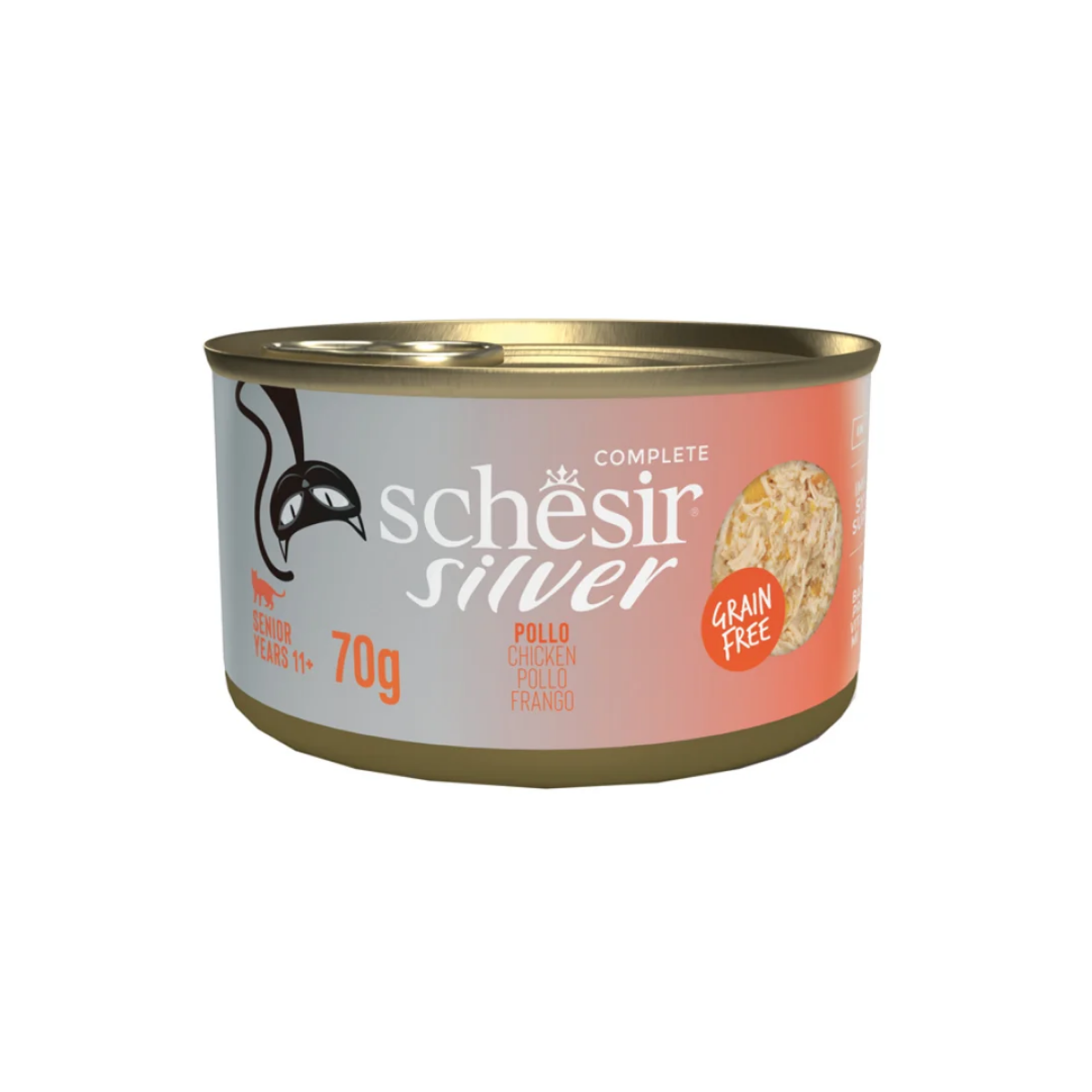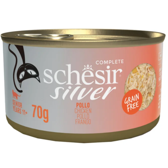 Dagli 11 anni di vita il gatto ha bisogni nutrizionali specifici legati all'età, ed è importante che l'alimentazione risponda alle sue esigenze. Schesir Silver è la linea di ricette complete e bilanciate per i gatti dagli 11 anni, pensate per supportare il funzionamento del sistema immunitario. A base di proteine da vere carni unite ad altri preziosi ingredienti. Senza cereali.