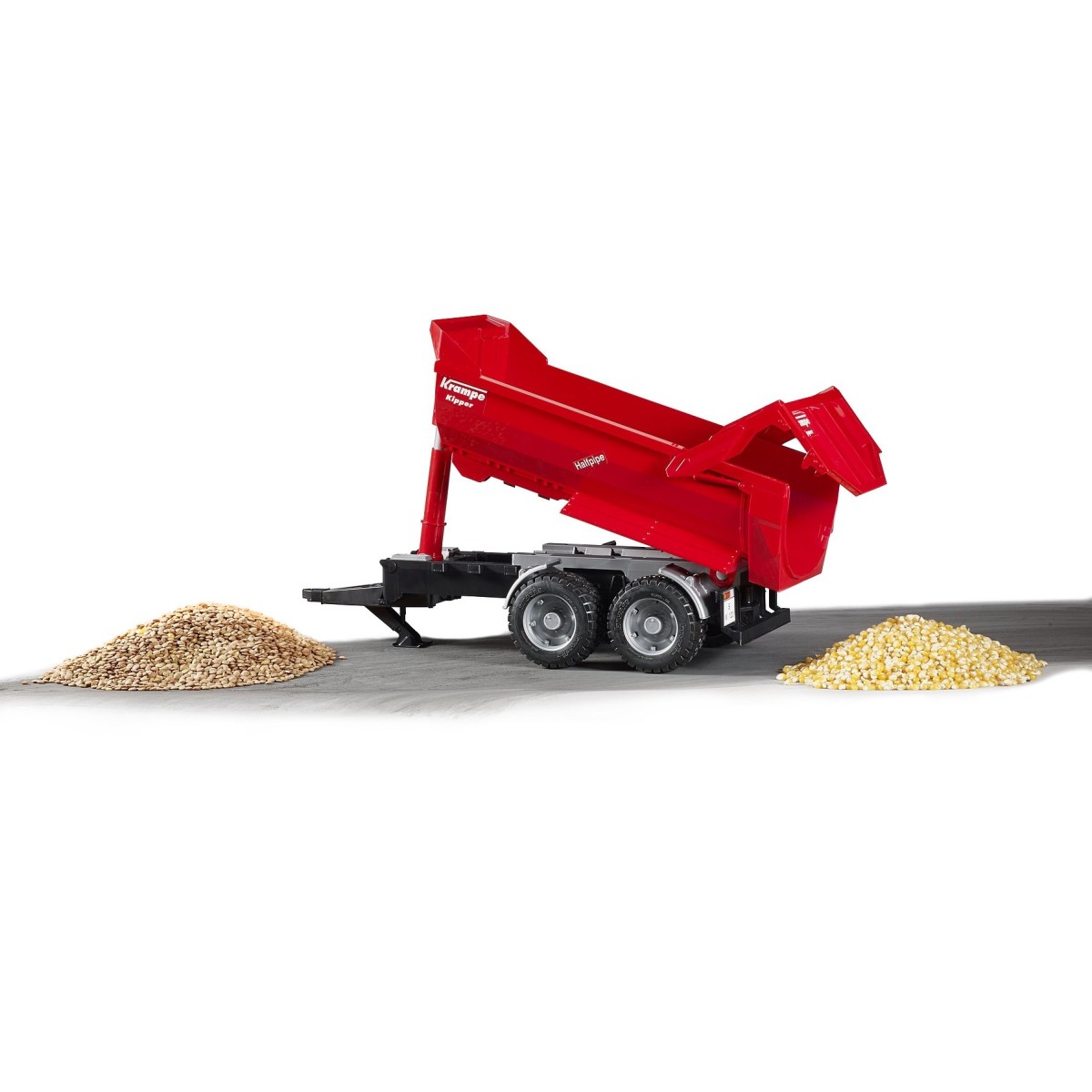 I rimorchi con cassone ribaltabile halfpipe stanno prendendo semprepiù piede per gestire in maniera efficiente i lavori di movimentoterra. Soprattutto quando il terreno è fangoso e difficile, spesso sipreferisce un'abbinata composta da una potente motrice con rimorchiohalfpipe ad asse tandem piuttosto che un camion. Tuttavia questorimorchio è utilizzato spesso anche in agricoltura. Il modello BRUDERsi contraddistingue per la definizione dei dettagli e presenta glistessi vantaggi dell'originale per potenti movimentazioni terra insabbionaia. Dotato di struttura robusta, ha forma atta a far sì cheil materiale caricato e, conseguentemente il baricentro, siano semprecentrati in maniera ottimale, assicurando così maggior stabilità dimarcia rispetto alle strutture rettangolari. Il cilindro diribaltamento è centrato sotto la parte anteriore del cassone, il chenell'originale determina un'eccellente trasmissione della forza alcassone stesso durante il processo di ribaltamento. Di talicaratteristiche beneficia anche il modello, che è dotato di undispositivo di arresto a scatti che arricchisce il gioco e gliconferisce un aspetto insuperabile. Il rimorchio Krampe con cassoneribaltabile halfpipe e asse tandem è un ulteriore prodotto di puntadel nostro assortimento di rimorchi agricoli.