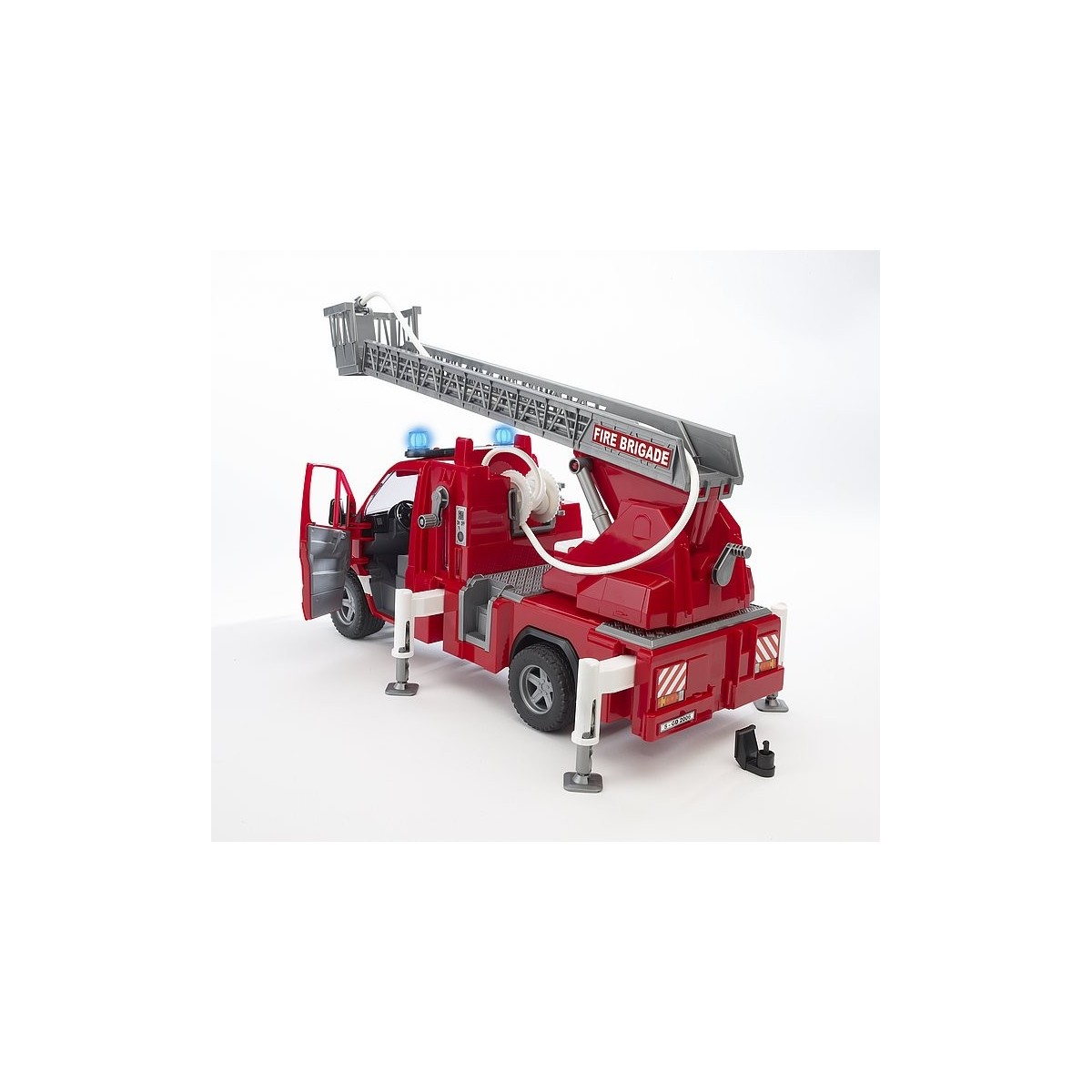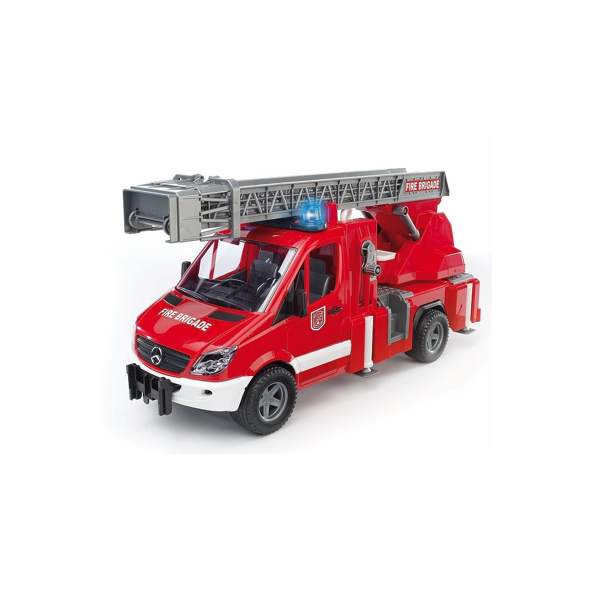 MB Sprinter è ancora uno dei modelli di maggior successo nella categoria degli autocarri leggeri. La versatilità d'uso e la varietà di combinazioni possibili ne fanno un veicolo indispensabile per attività commerciali, edili, amministrative, agricole, paesaggistiche o, ancora, come veicolo di emergenza. Per gli incendi difficili da estinguere, ad esempio nei viottoli cittadini, è sempre maggiore la richiesta di veicoli antincendio più piccoli. A tale riguardo, il modello Sprinter si è dimostrato la soluzione ideale, e questo grazie alla straordinaria manovrabilità. BRUDER ha realizzato questo veicolo antincendio fornendolo di tanti dettagli funzionali assolutamente realistici. Nello specifico, il veicolo presenta una scala estraibile con cestello, un funzionalissimo getto d'acqua con pompa a stantuffo visibile e in azione, un serbatoio dell'acqua, dei piedi d'appoggio estraibili, vari contenitori porta-utensili e segnali luminosi e acustici con effetti realistici, il tutto per un giocattolo dal divertimento assicurato.